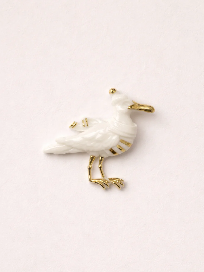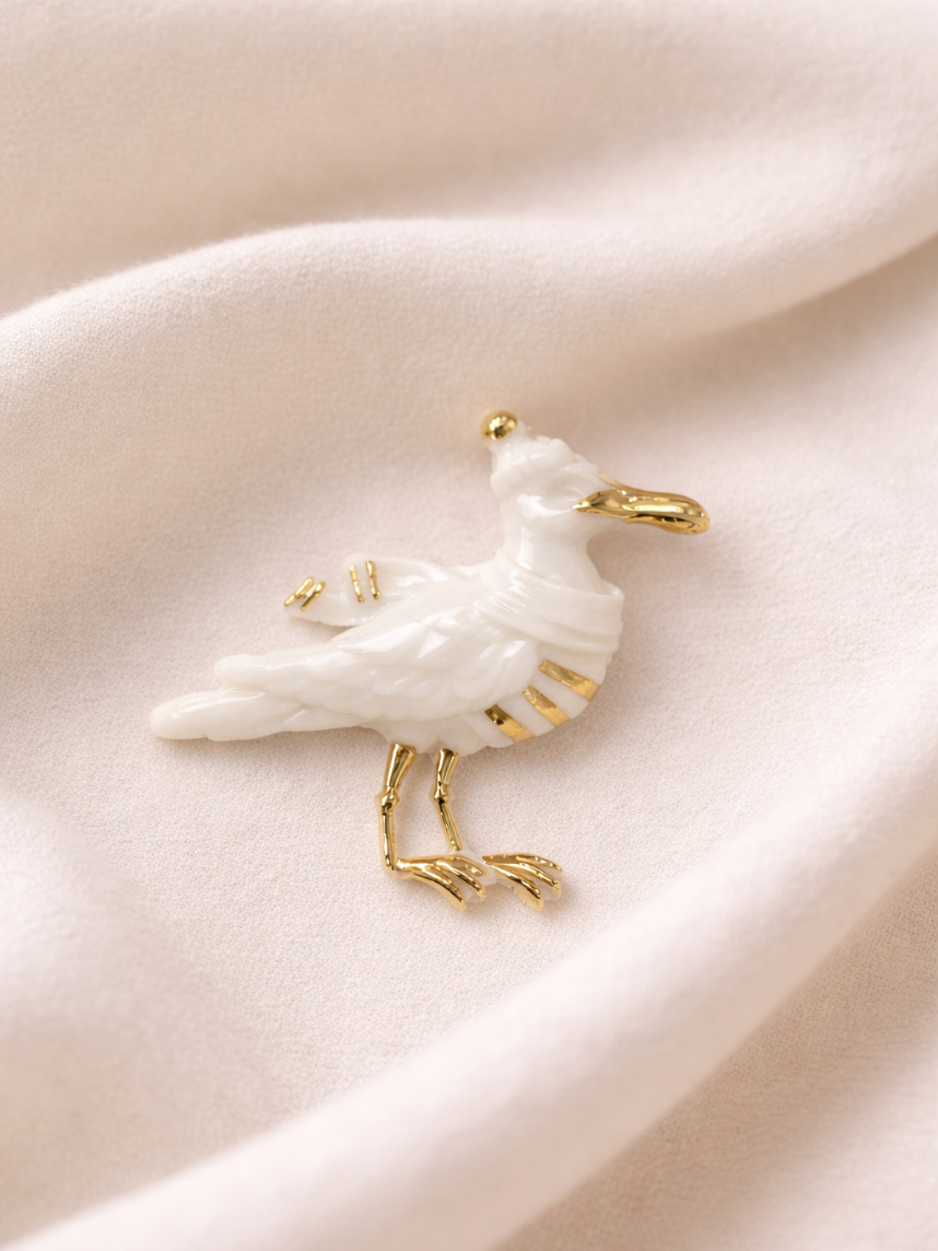 Фарфоровая брошь «Чайка» бело-золотистого цвета.