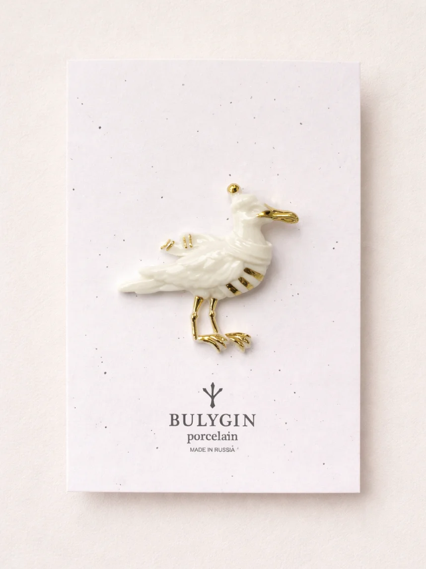 Брошь ручной работы Фарфор Булыгина «Чайка», бело-золотистая