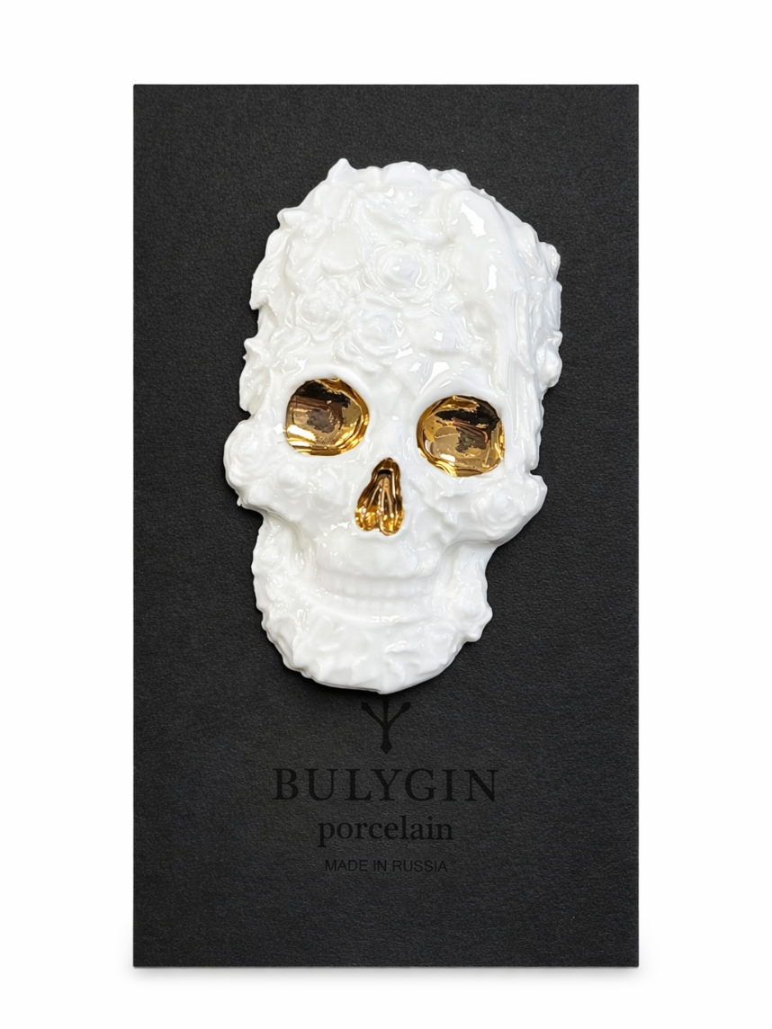 Брошь ручной работы Bulygin «Череп» большая, фарфор, бело-золотистая