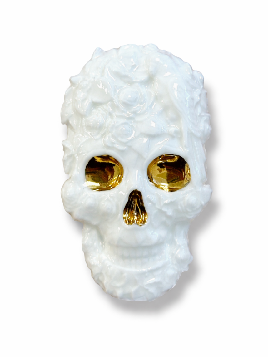 Фарфоровая брошь «Череп» большая бело-золотого цвета., размер 6*4 см.