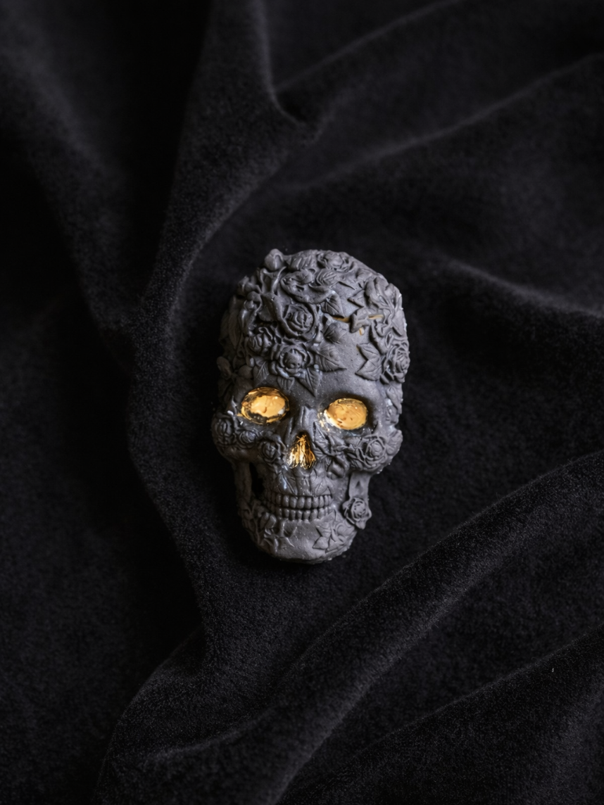 Брошь ручной работы Bulygin «Череп» большая, фарфор, чёрно-золотистая