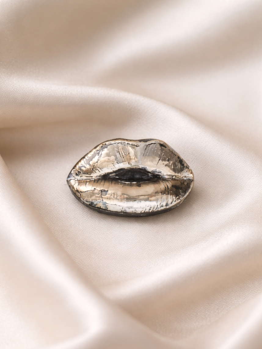 Фарфоровая брошь «Губы» в чёрно-серебряном цвете.