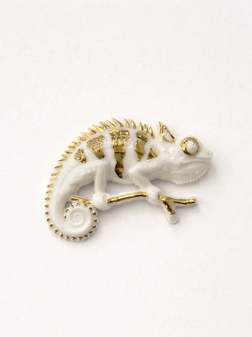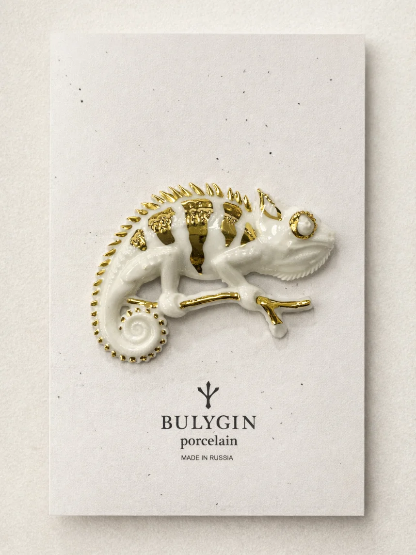 Фарфоровая брошь «Хамелеон» бело-золотистого цвета.