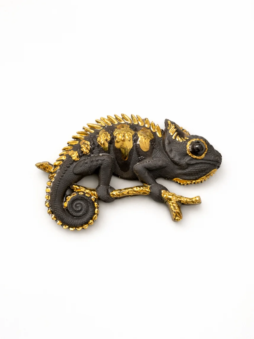 Фарфоровая брошь «Хамелеон» черно-золотистого цвета.