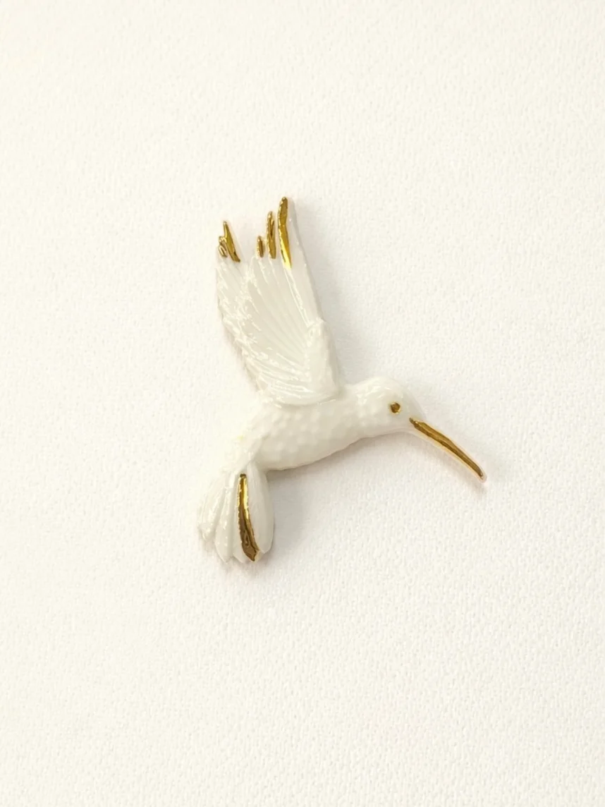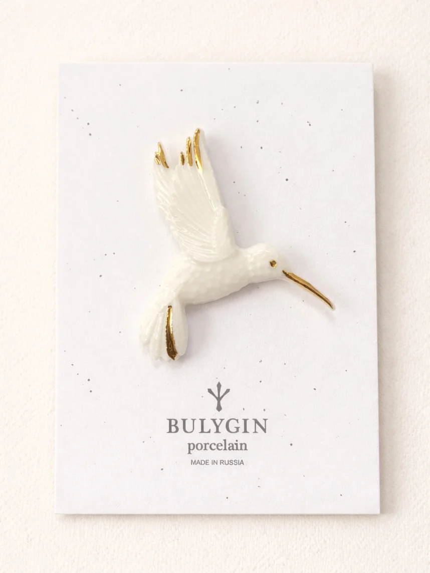 Фарфоровая брошь «Колибри» бело-золотистого цвета.