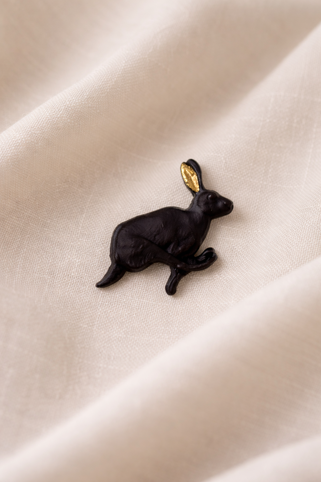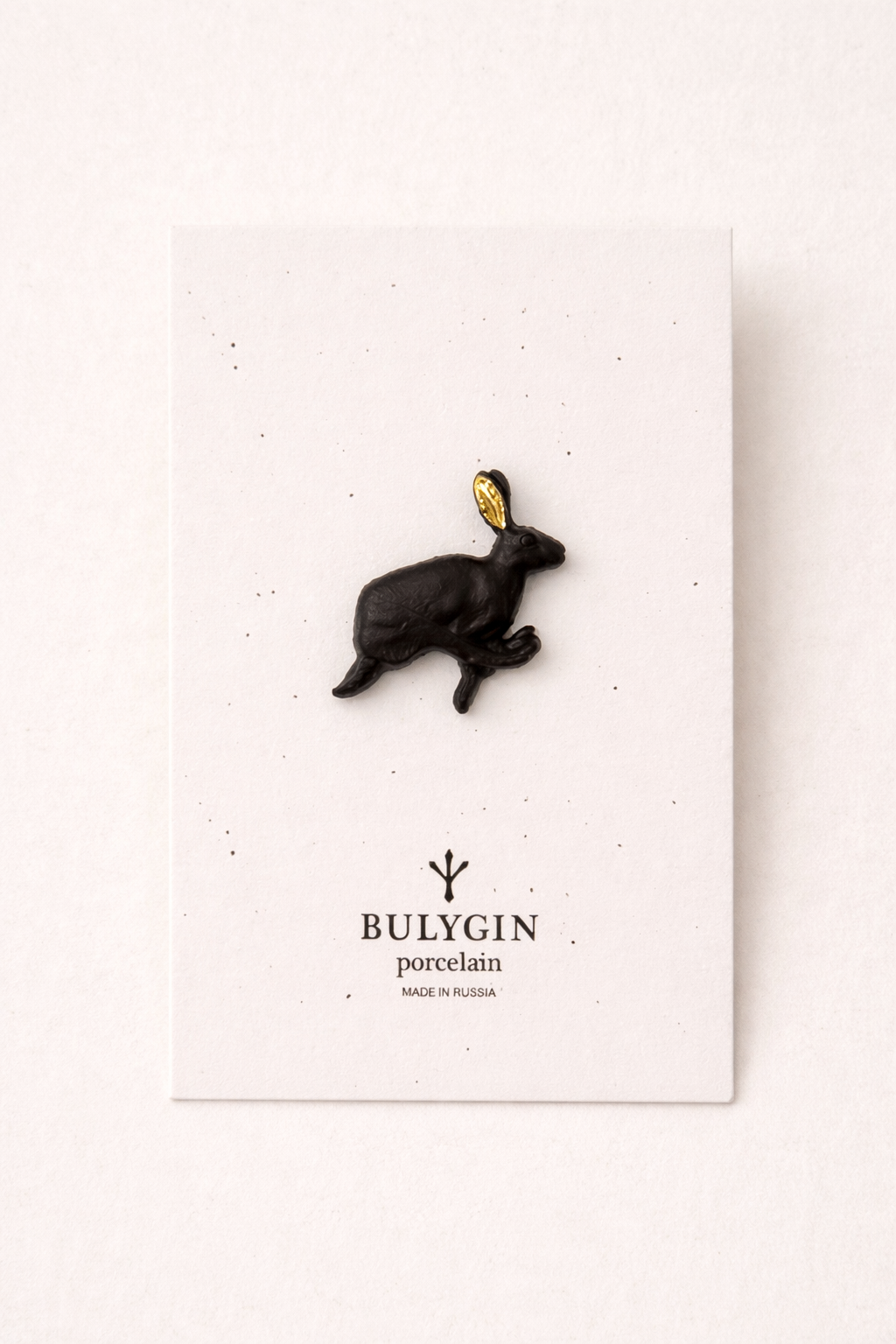 Фарфоровая брошь «Кролик» черно-золотистого цвета.