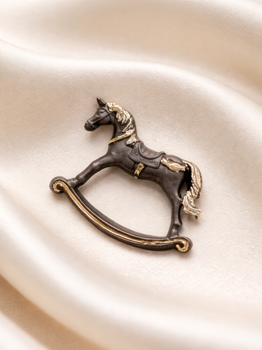 Фарфоровая брошь «Лошадка» чёрно-серебристого цвета.