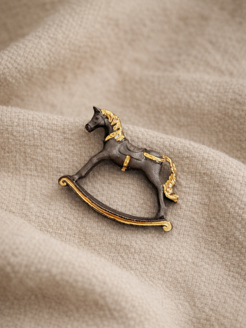 Фарфоровая брошь «Лошадка» чёрно-золотистого цвета.
