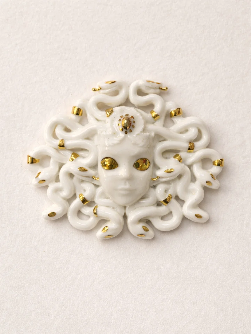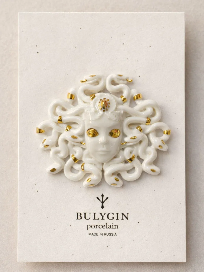 Фарфоровая брошь «Медуза Горгона» бело-золотистого цвета.