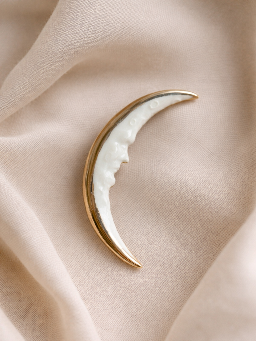 Фарфоровая брошь «Месяц» бело-серебристого цвета.