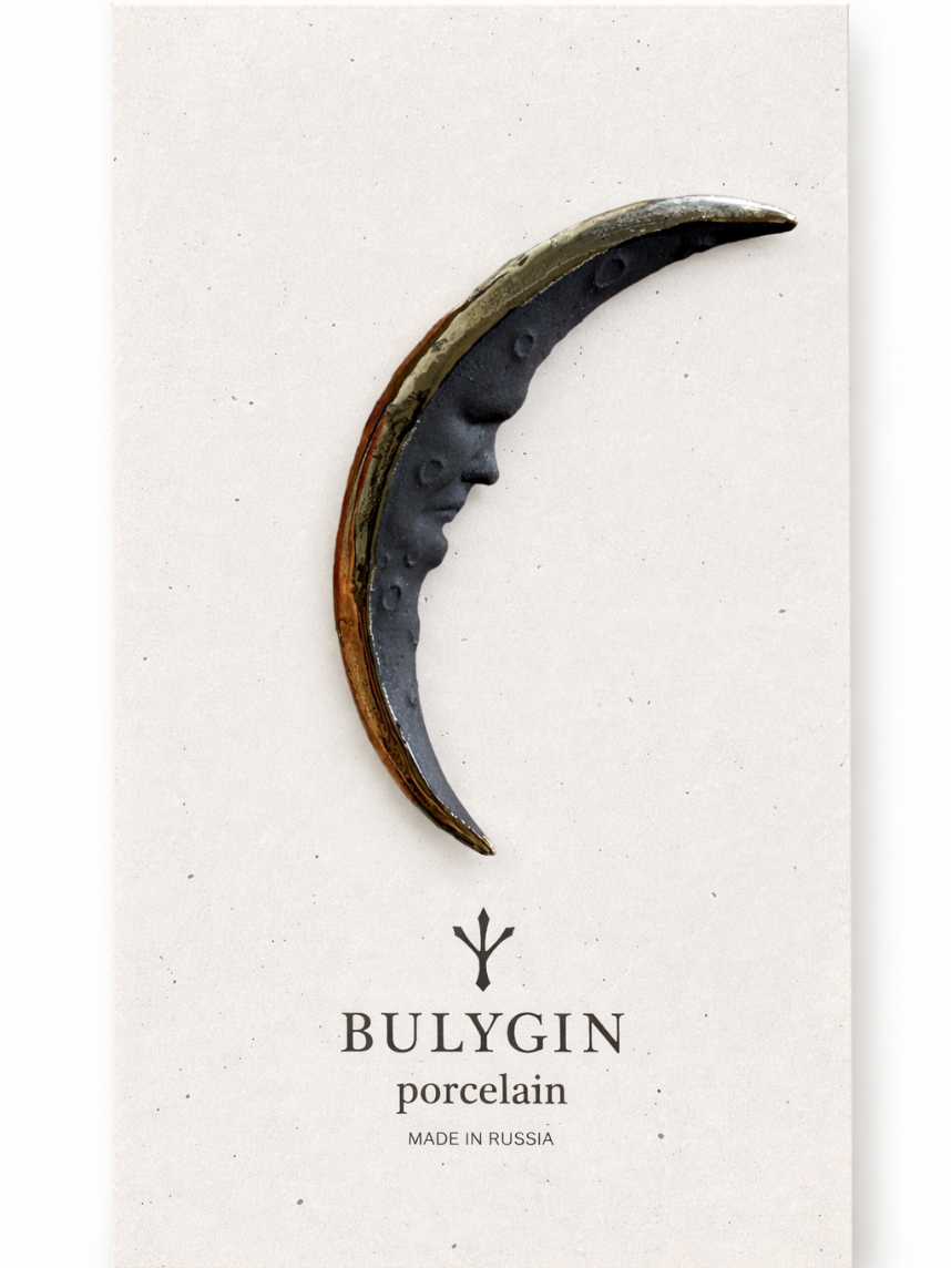 Брошь ручной работы Bulygin «Месяц», фарфор, чёрно-серебристая