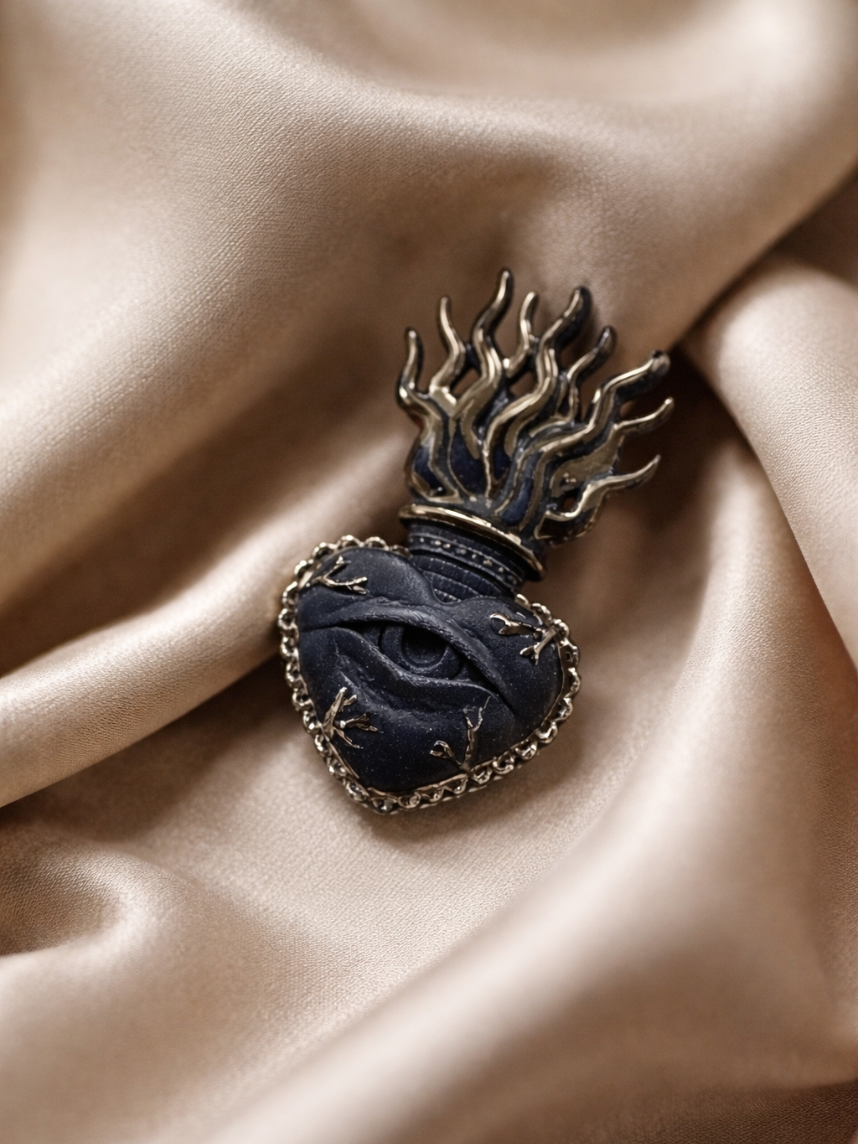 Фарфоровая брошь «Огненное сердце» в чёрно-серебряном цвете.