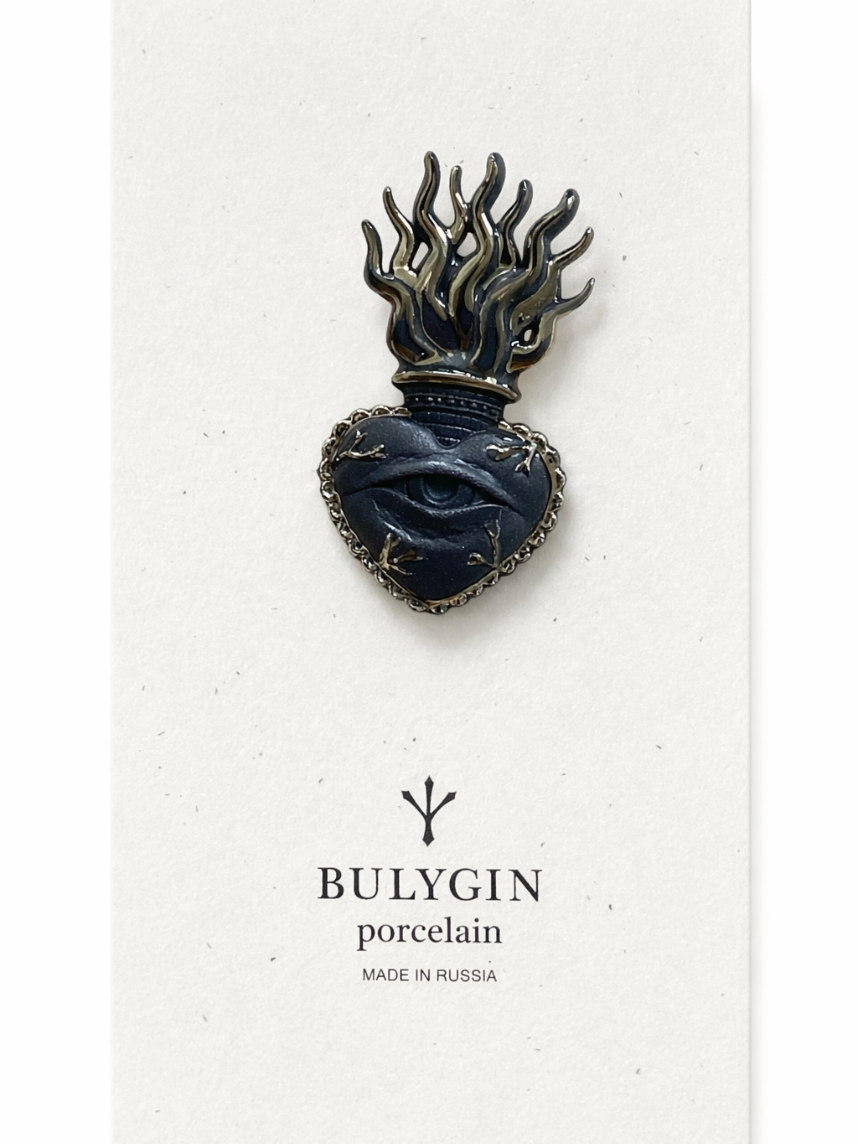 Брошь ручной работы Bulygin «Огненное сердце», фарфор, чёрно-серебристая