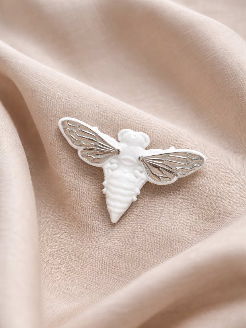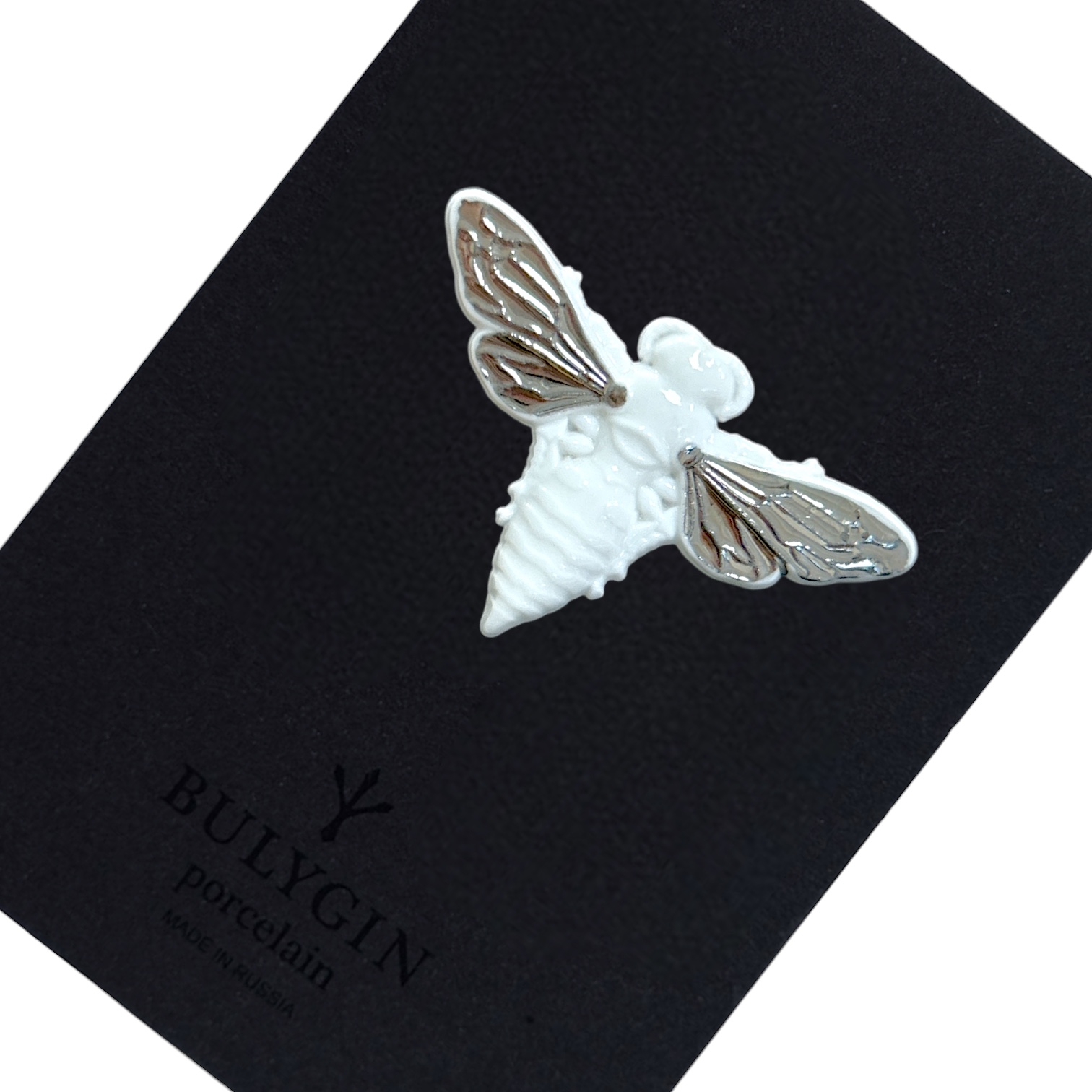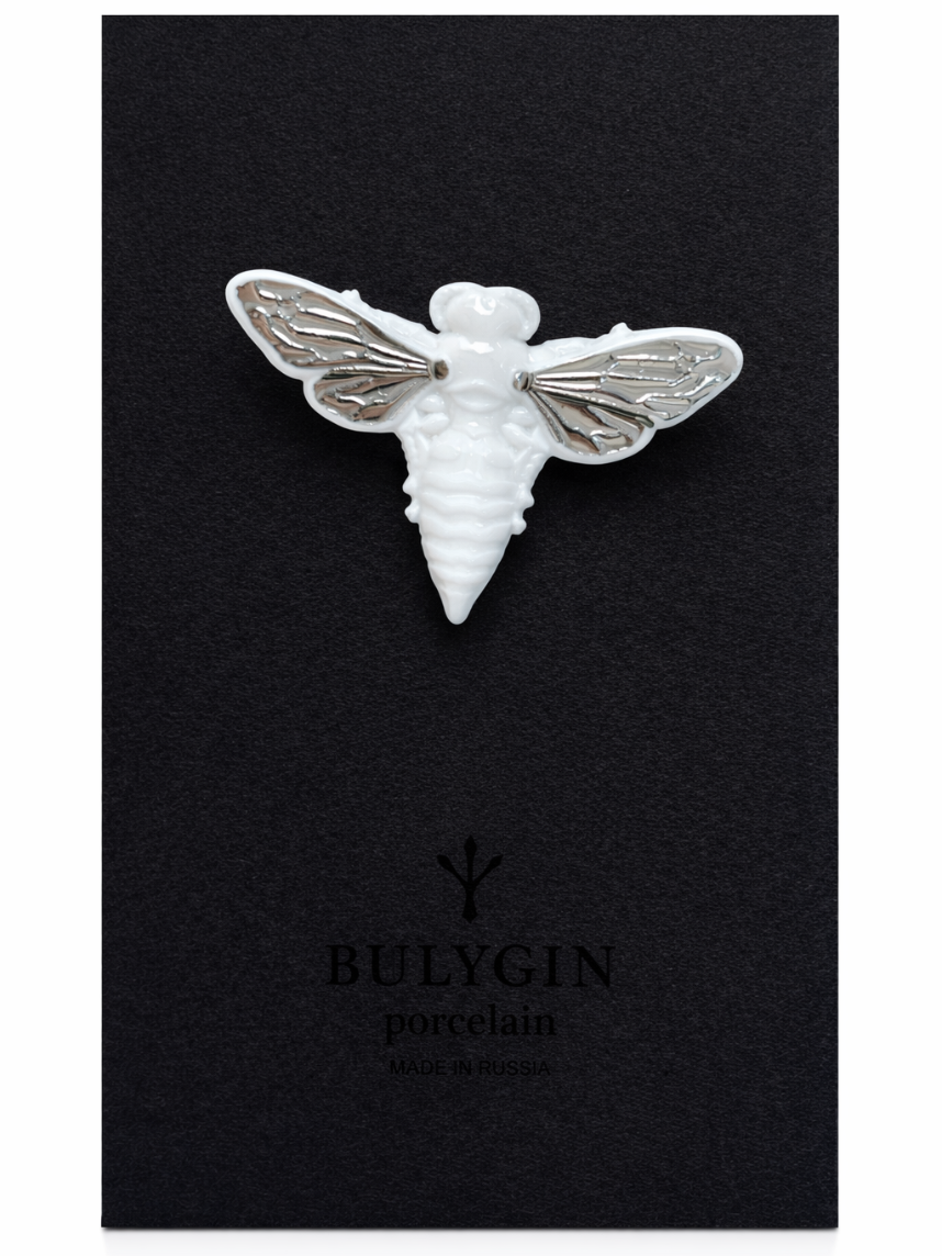 Фарфоровая брошь «Пчела» в бело-серебристом цвете.