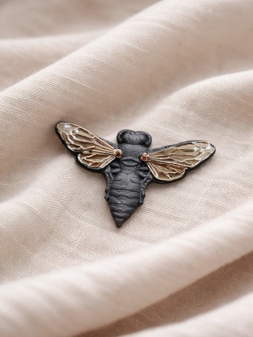 Фарфоровая брошь «Пчела» в чёрно-серебристом цвете.