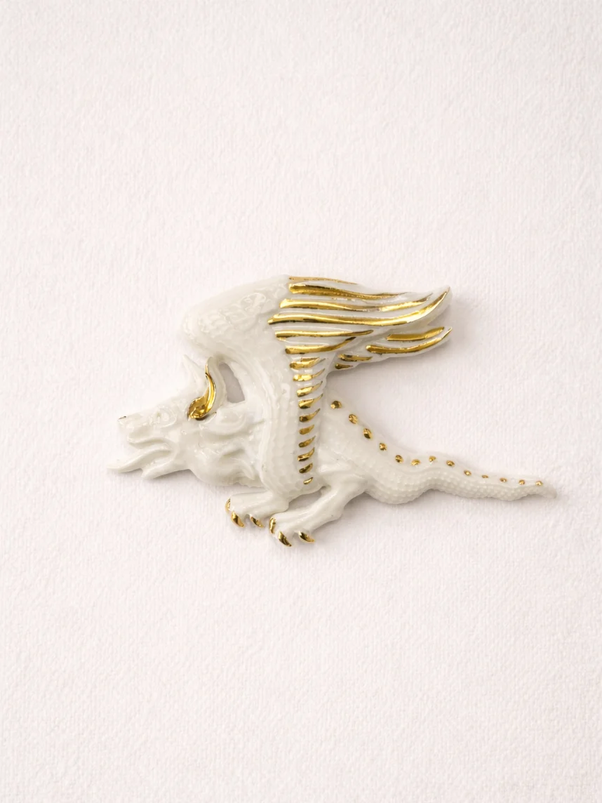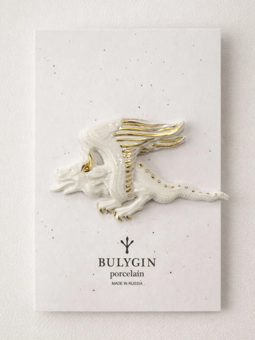 Фарфоровая брошь «Песозмей» бело-золотистого цвета.