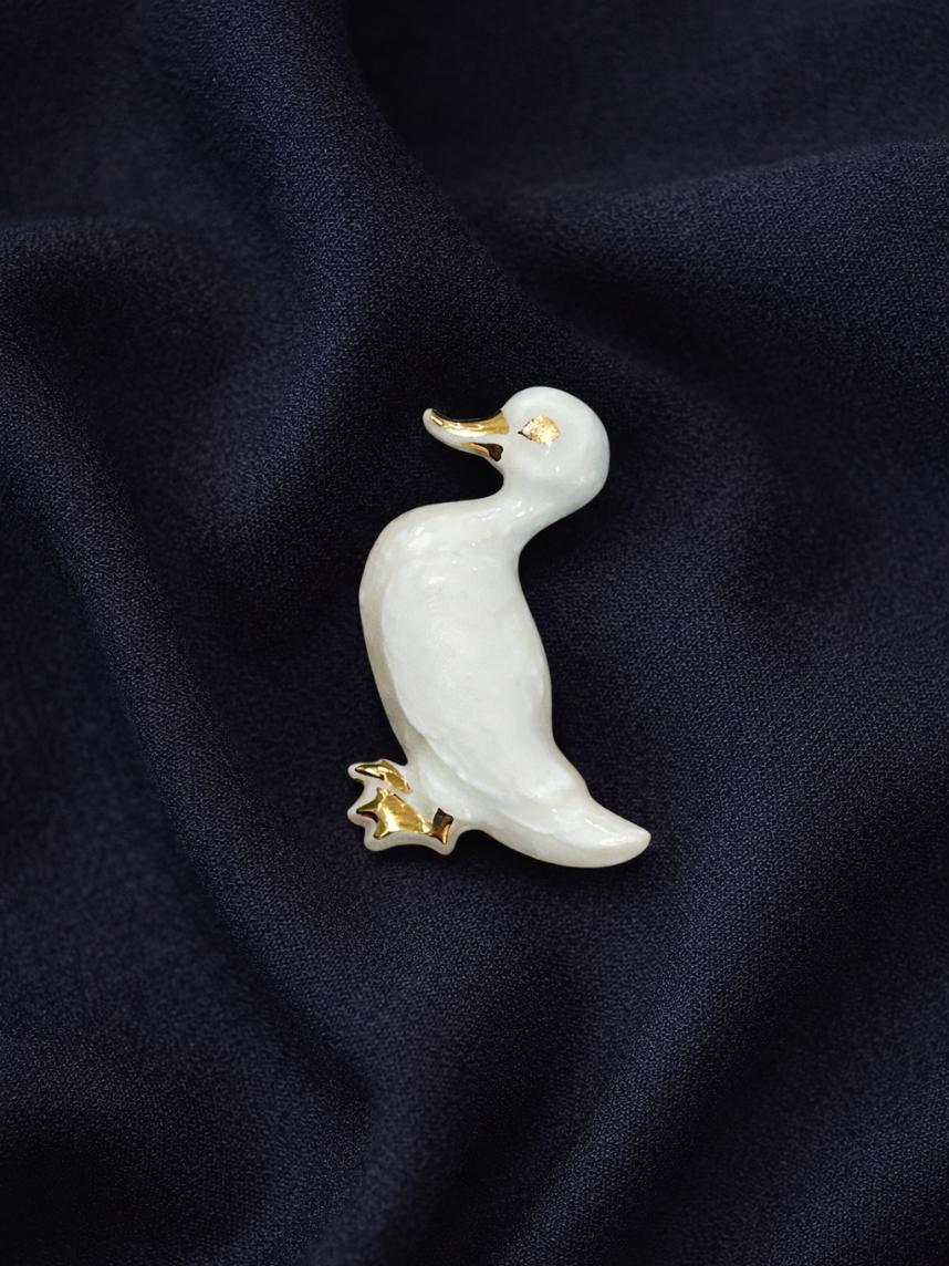 Фарфоровая брошь «Уточка» в бело-золотистом цвете.
