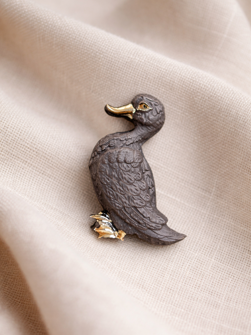 Фарфоровая брошь «Уточка» в чёрно-золотом цвете.