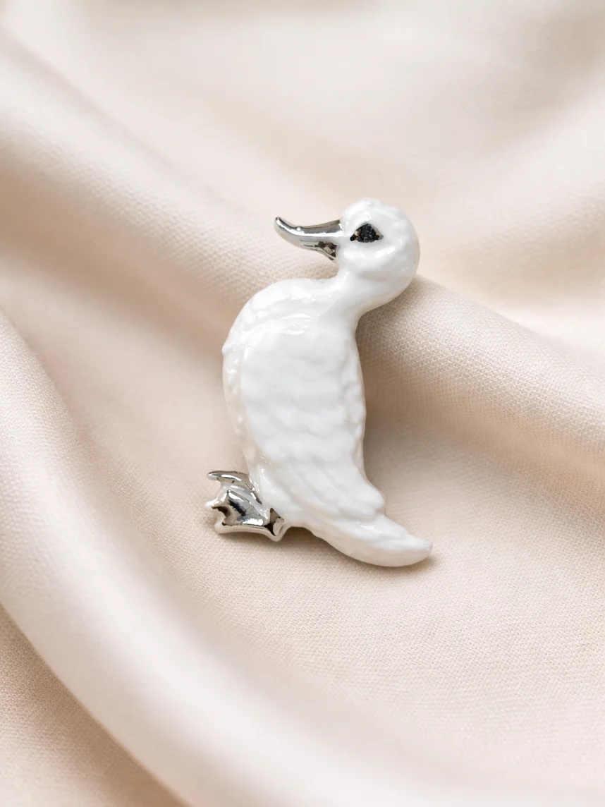 Фарфоровая брошь «Уточка» в бело-серебристом цвете.