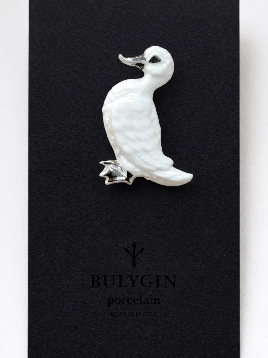 Брошь ручной работы Фарфор Булыгина «Уточка», бело-серебристая