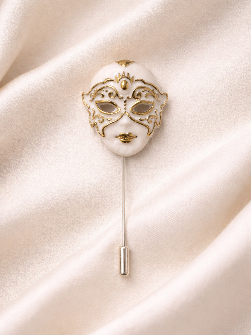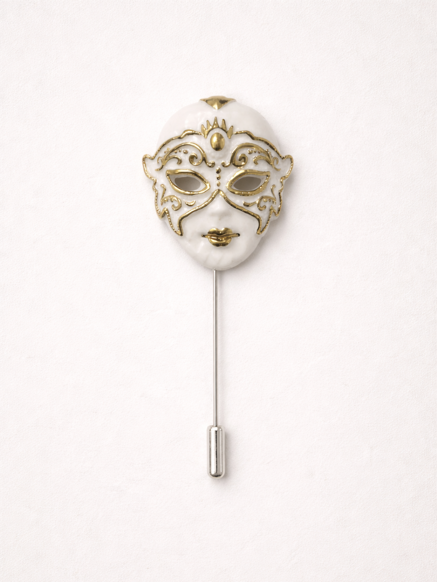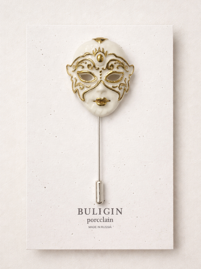 Фарфоровая брошь «Венецианская маска» в бело-золотистом цвете.