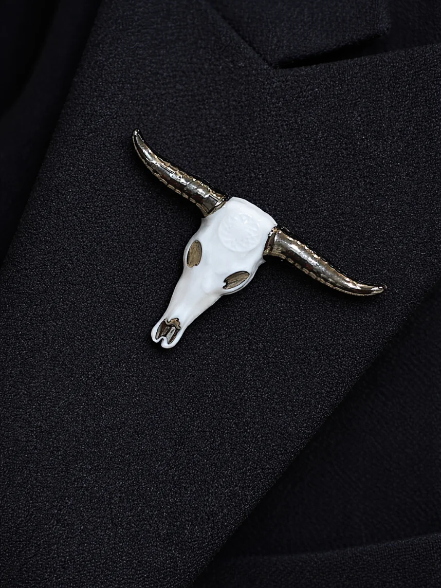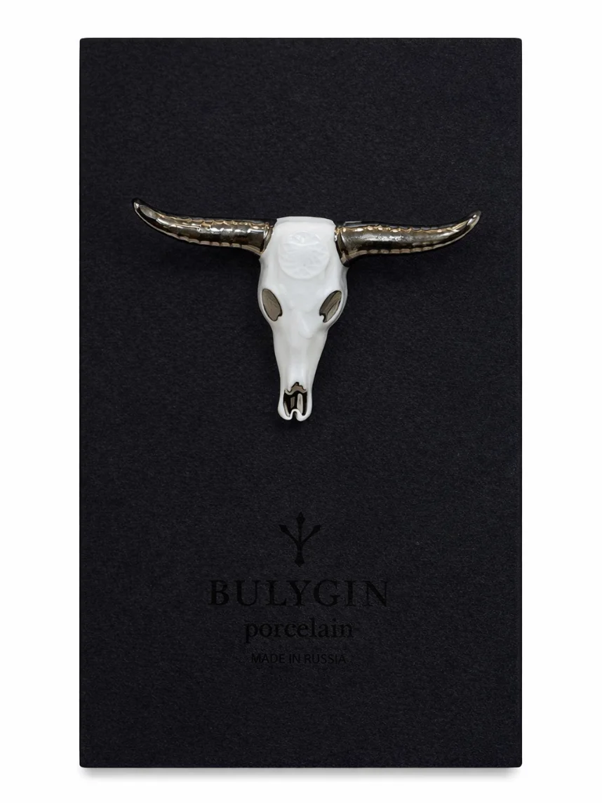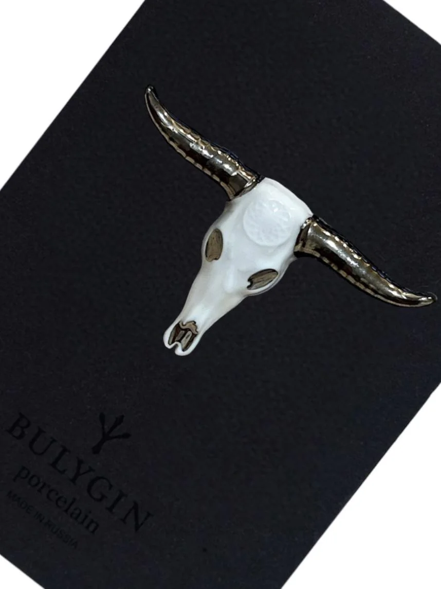 Фарфоровая брошь «Бык» бело-серебристого цвета.