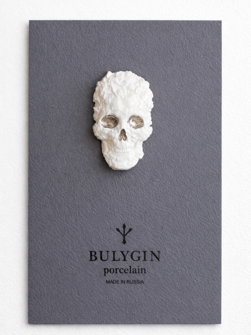 Брошь ручной работы Bulygin «Череп» малый, бело-серебристая, фарфор