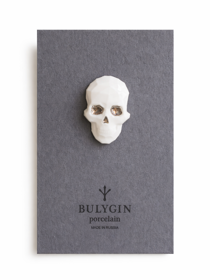 Брошь ручной работы Bulygin «Череп полигональный», бело-серебристая, фарфор
