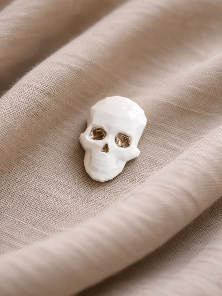 Фарфоровая брошь «Череп полигональный» бело-серебристого цвета.