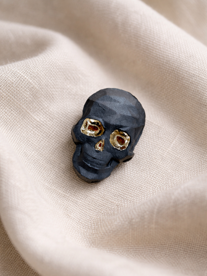 Фарфоровая брошь «Череп полигональный» в чёрно-серебряном цвете.