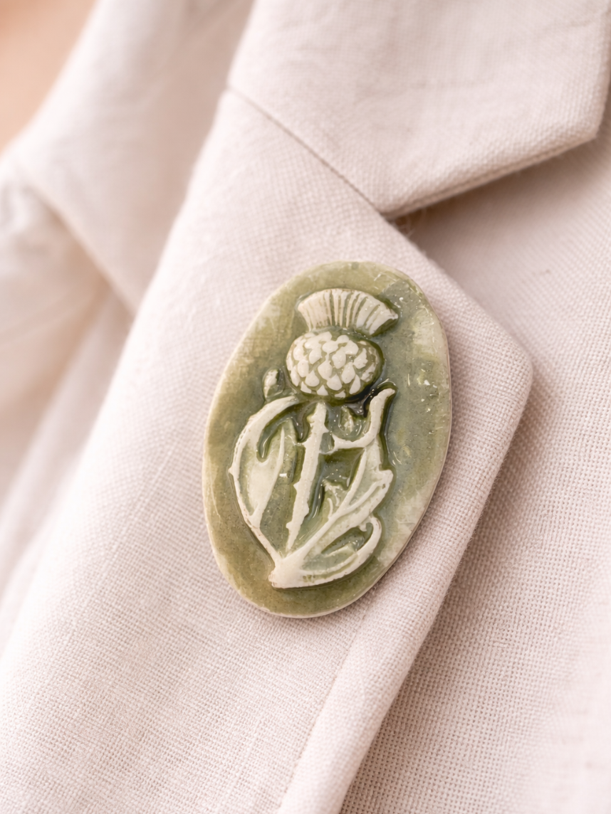 Брошь «Чертополох» - аккуратное украшение, выполненное в виде чертополоха. Миниатюрный символ природы на вашем пальто, сумке или в качестве элемента декора подчеркнет вашу индивидуальность.
