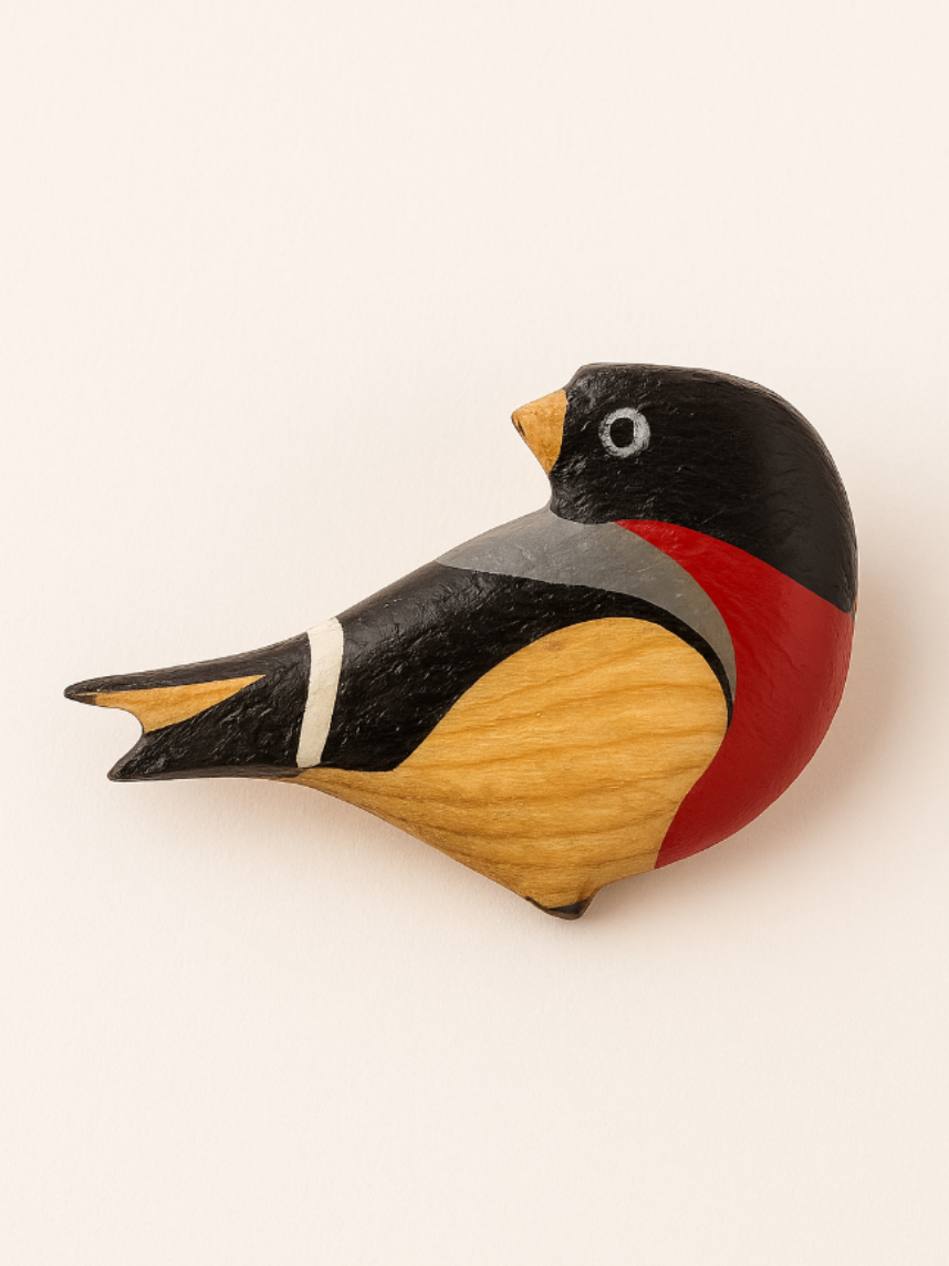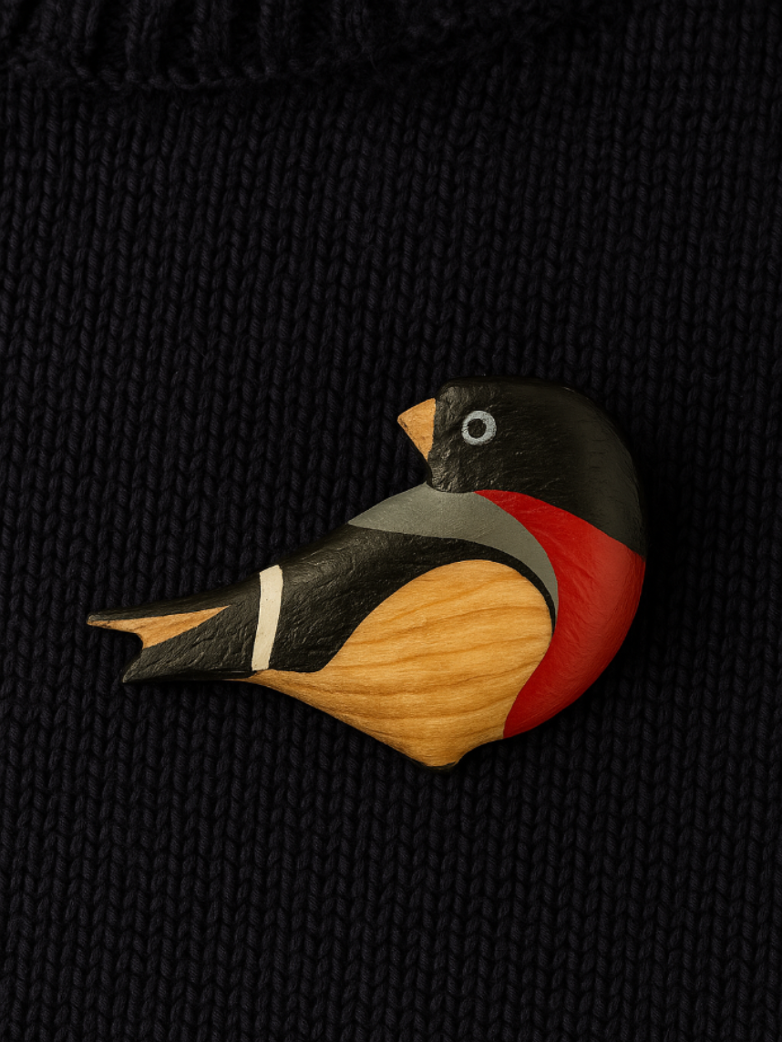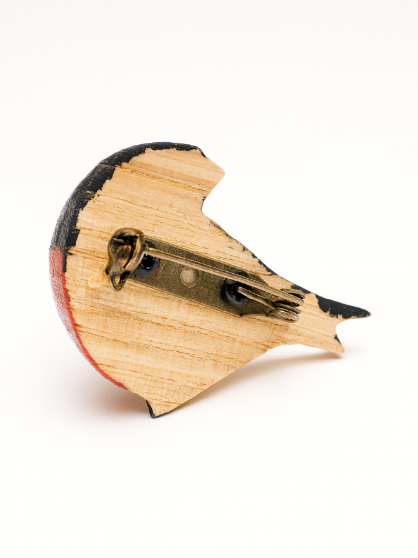 Брошь «Дальневосточный снегирь» от бренда Free in tree - деревянная ручной работы с росписью. Это идеальный аксессуар для любителей живой природы.