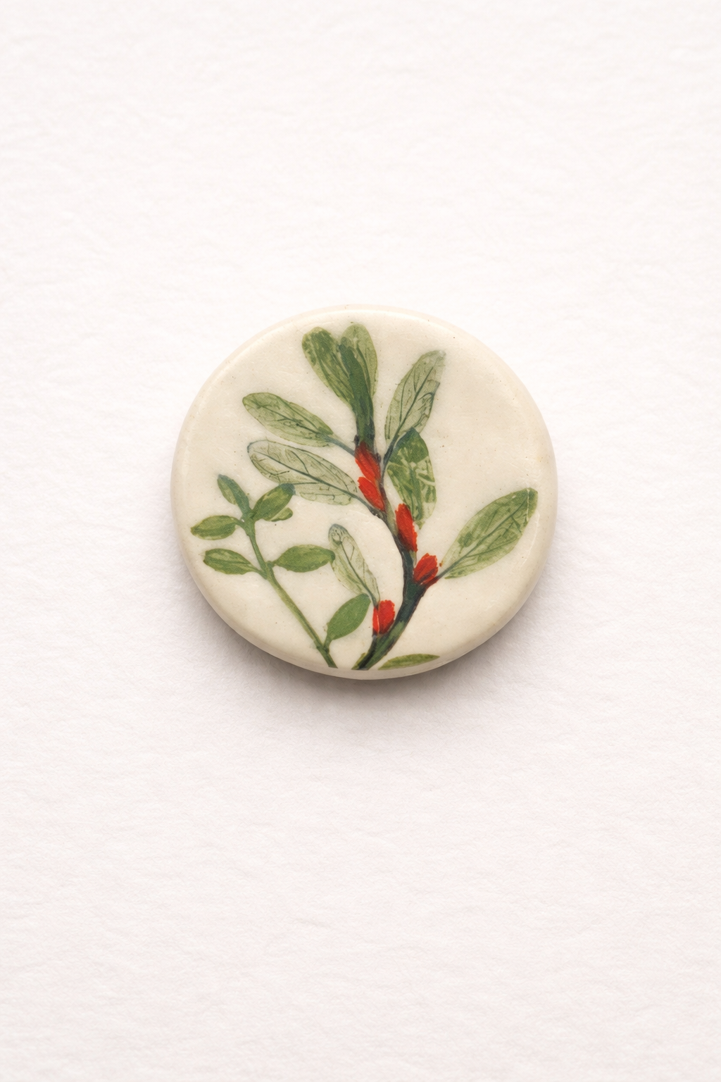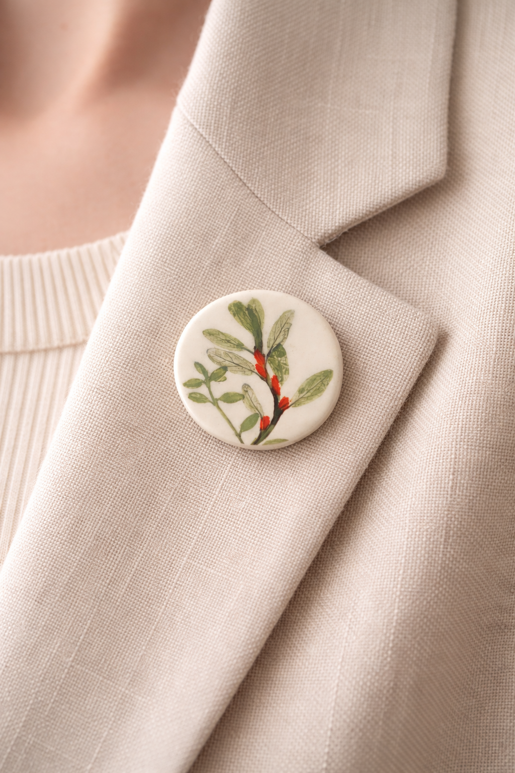 Брошь «Оттиск трав»№2 - аккуратное украшение, которое привлечет внимание своей оригинальностью и стилем. Эта брошь круглой формы с зеленой росписью имеет размер около 2 см и станет прекрасным дополнением к вашему пальто или сумке.