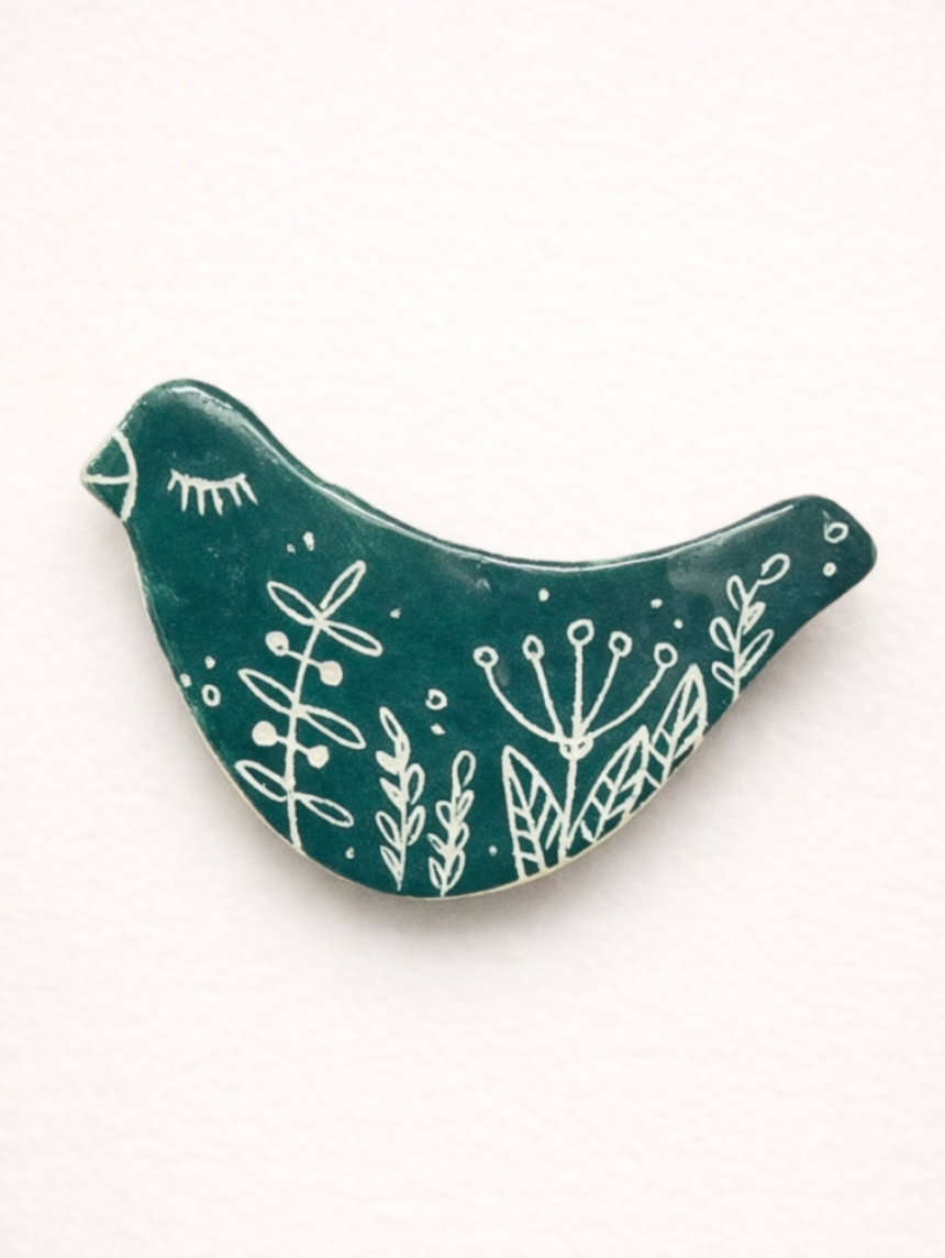 Брошь ручной работы Голубка и травы, зелёная, керамика