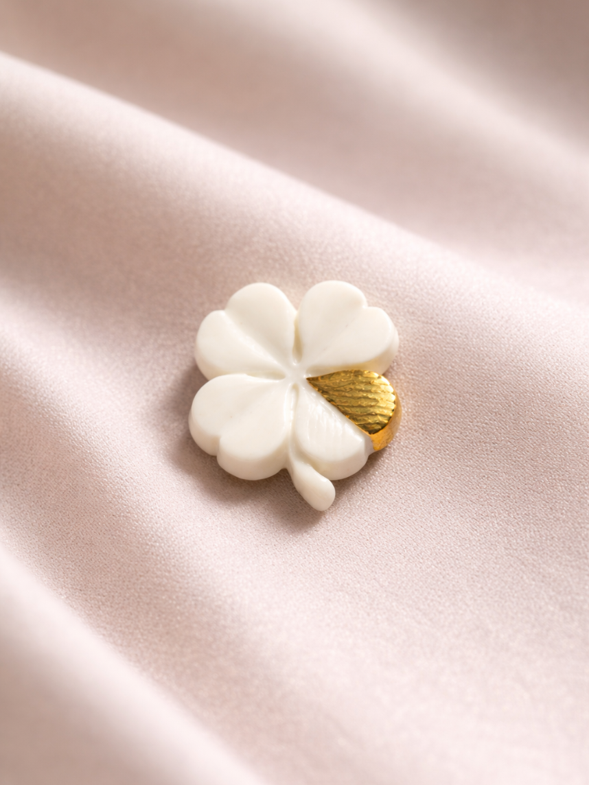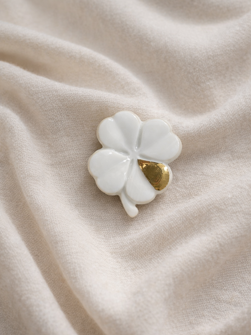 Фарфоровая брошь «Клевер» в бело-золотистом цвете.