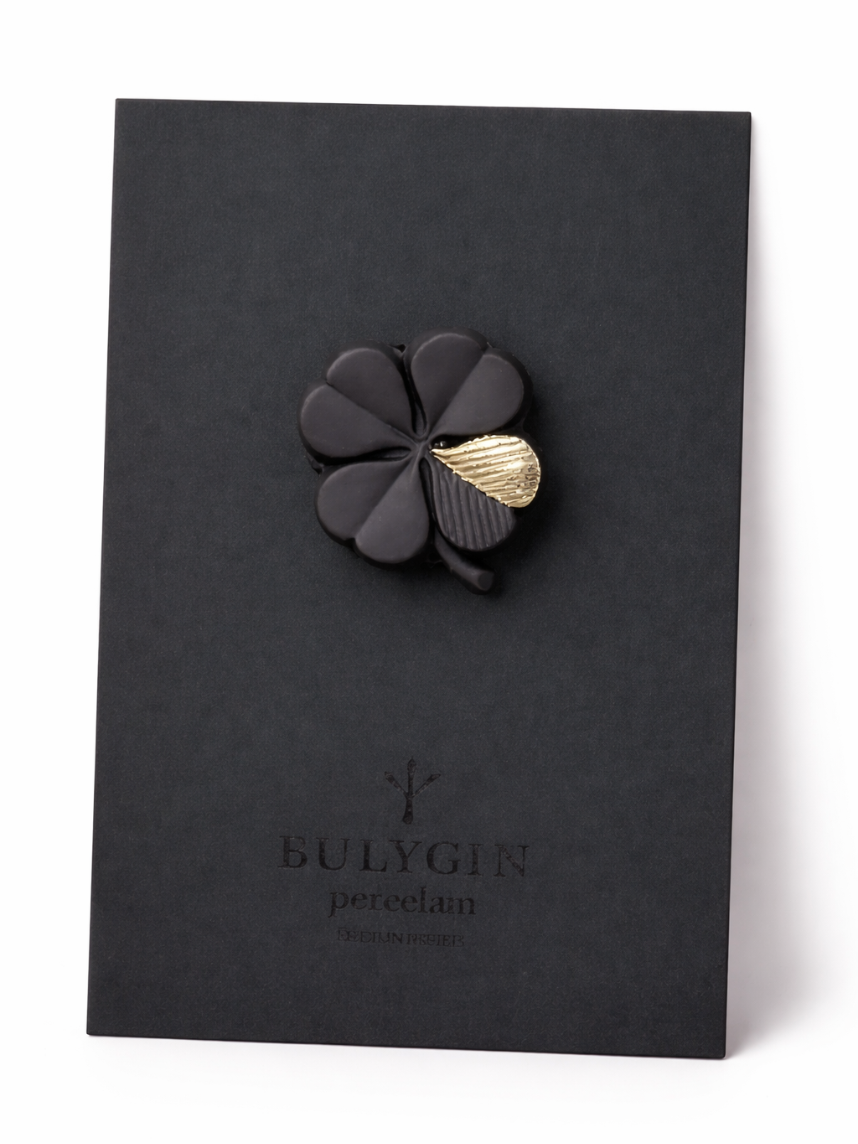 Брошь ручной работы Bulygin «Клевер», фарфор, чёрно-серебристая