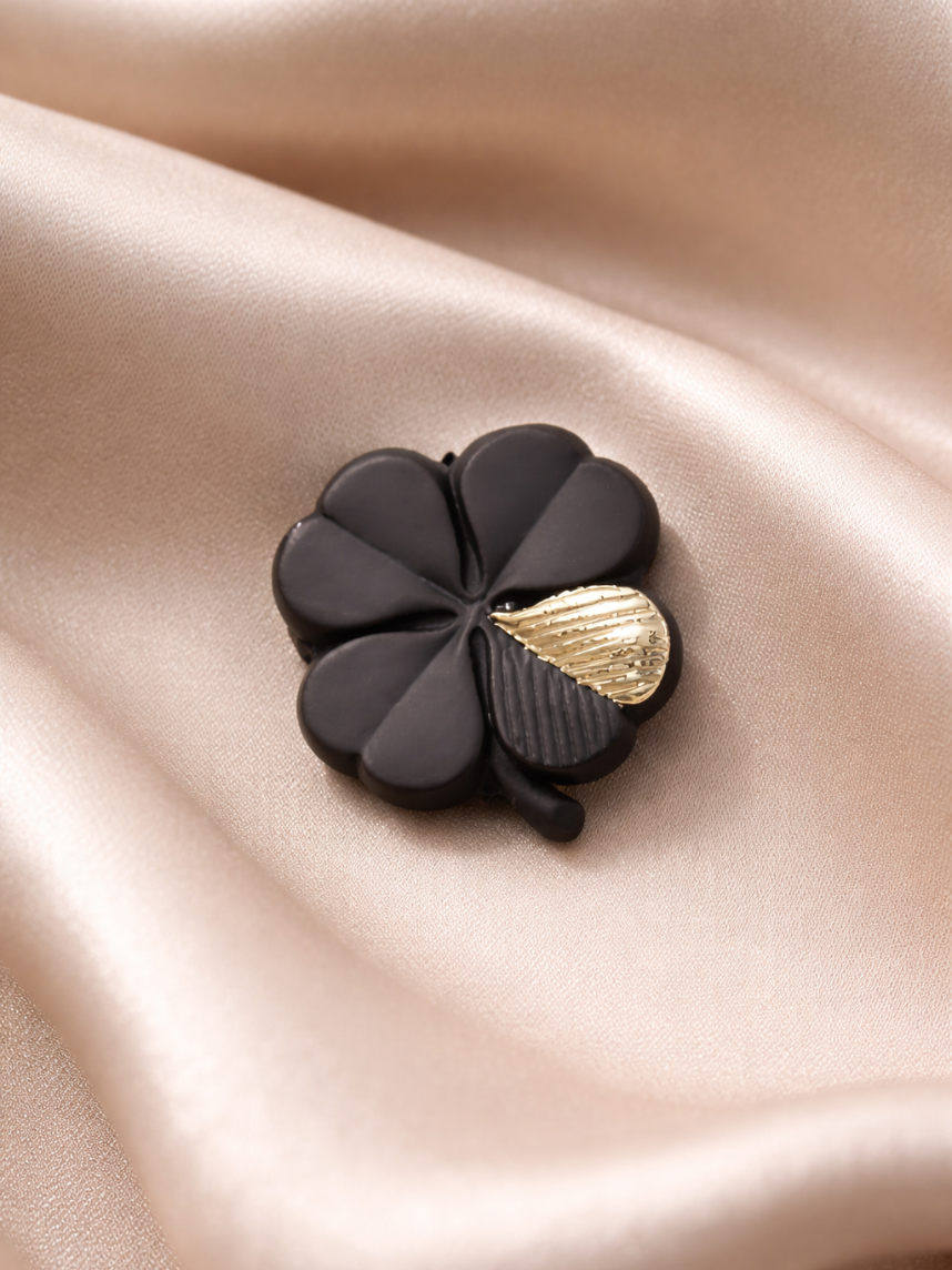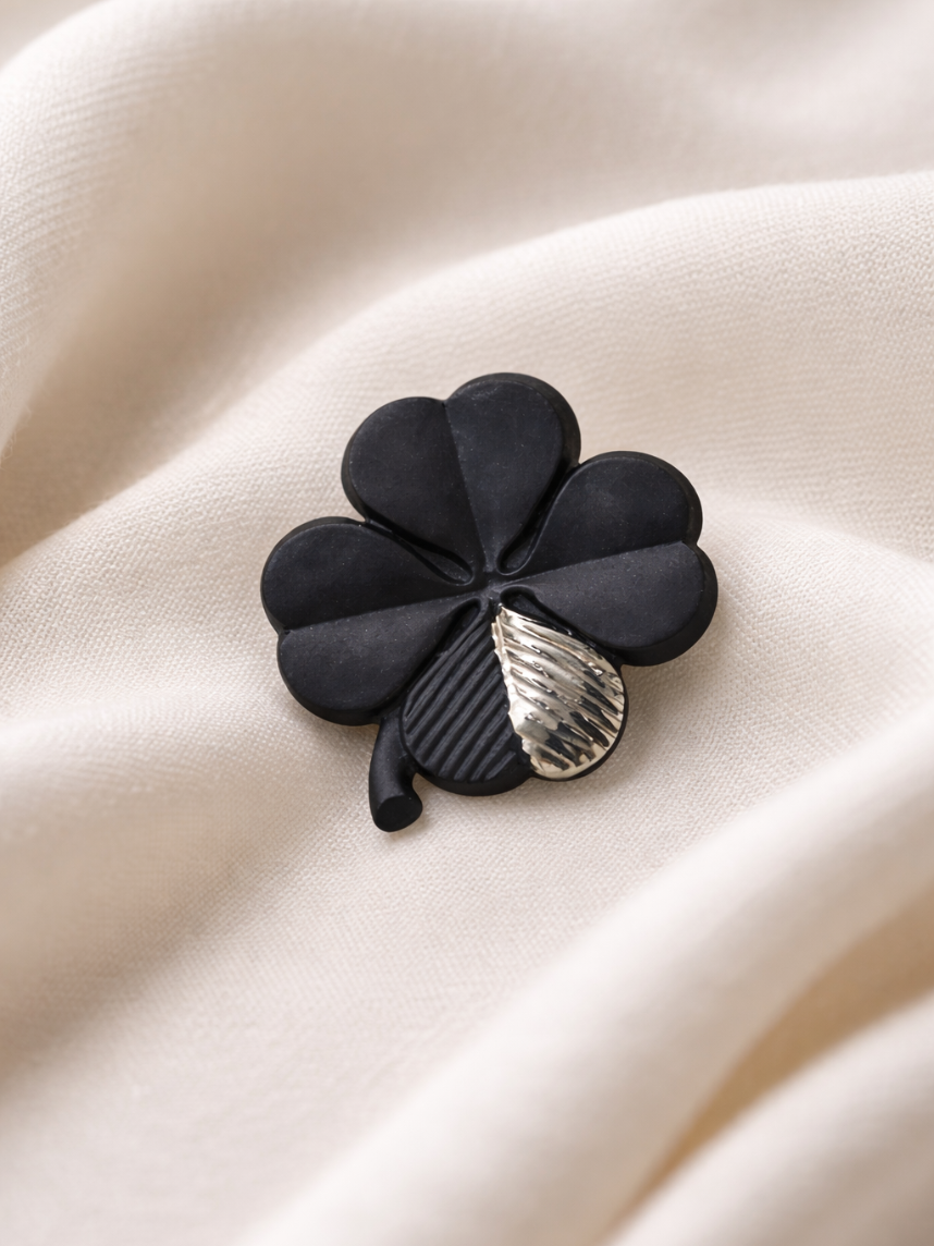 Фарфоровая брошь «Клевер» в чёрно-серебряном цвете.