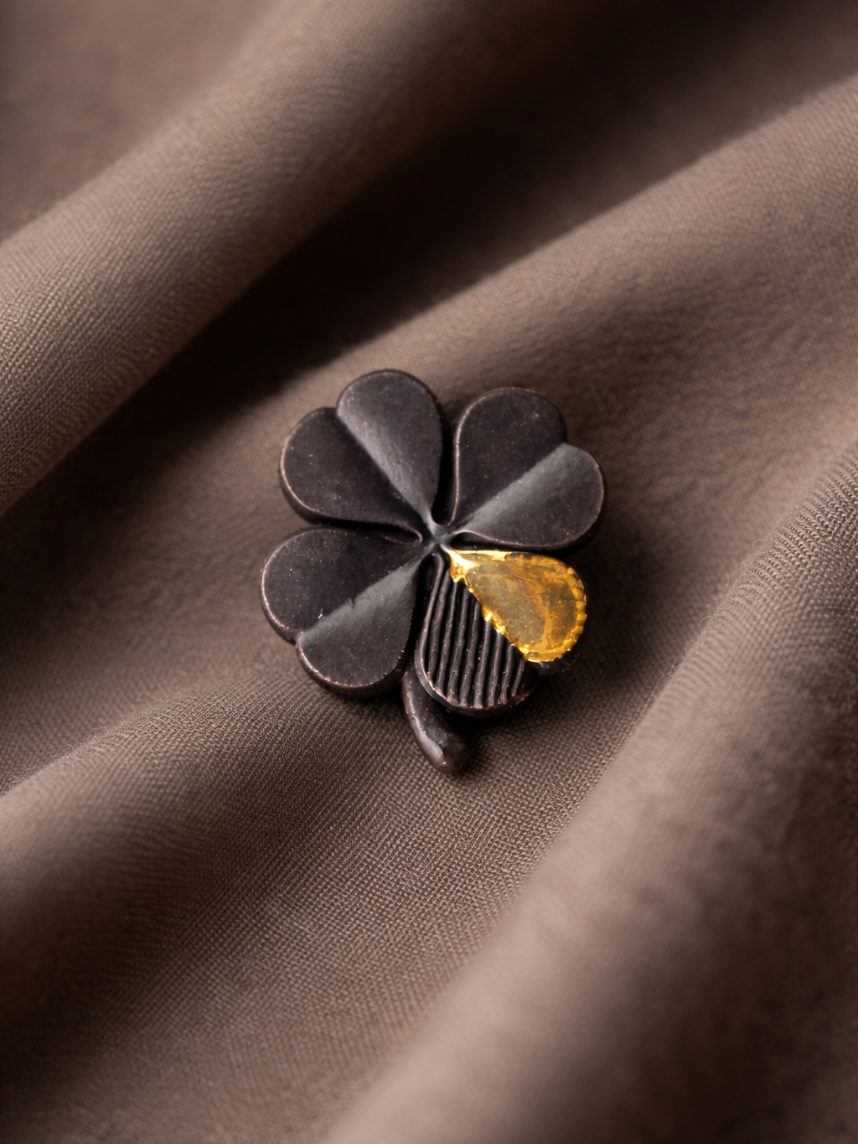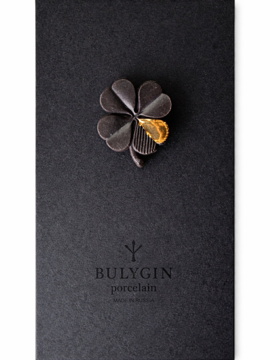 Брошь ручной работы Bulygin «Клевер», фарфор, чёрно-золотистая