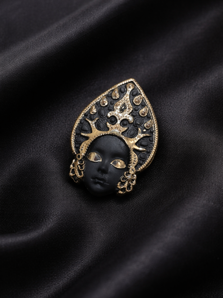 Фарфоровая брошь «Кокошник» в чёрно-серебряном цвете.