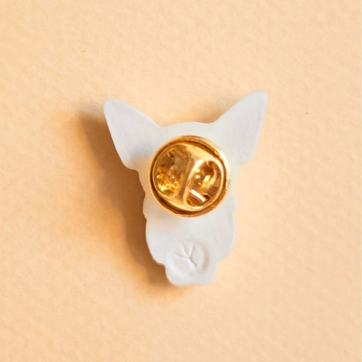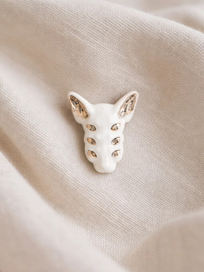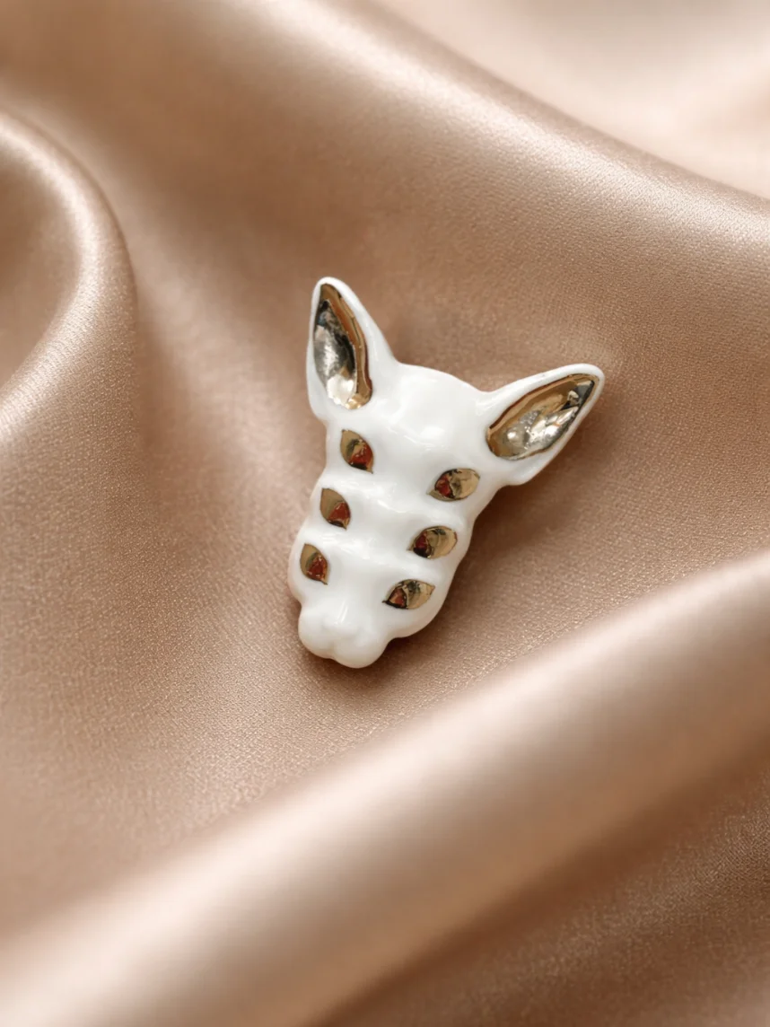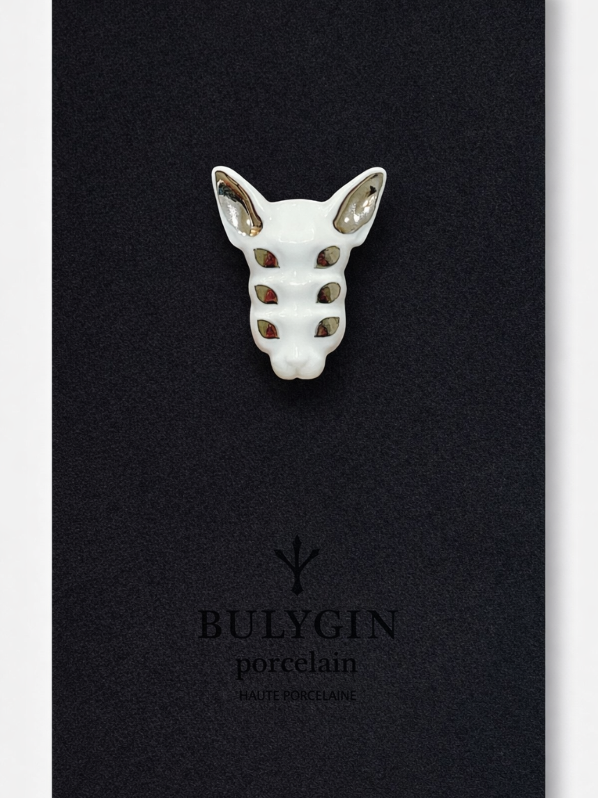 Фарфоровая брошь «Кошка 6 глаз» бело-серебристого цвета.