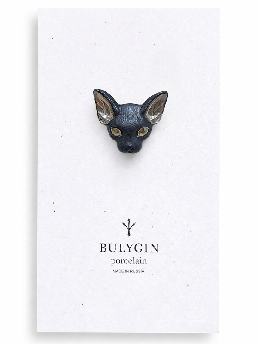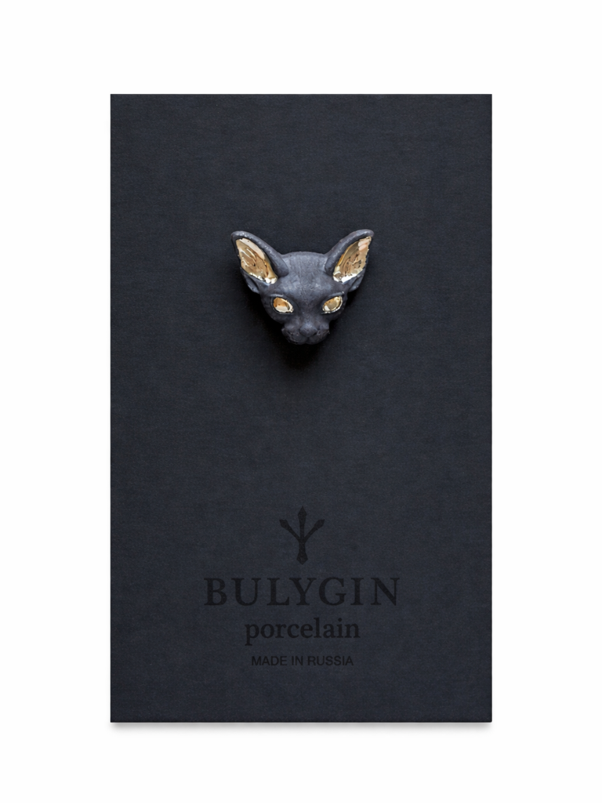 Брошь ручной работы Bulygin «Кошка», фарфор, чёрно-серебристая