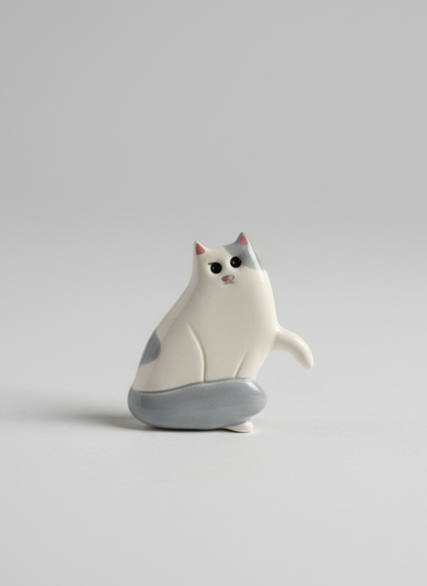 Брошь ручной работы «Кот с лапкой», бело-серый, керамика