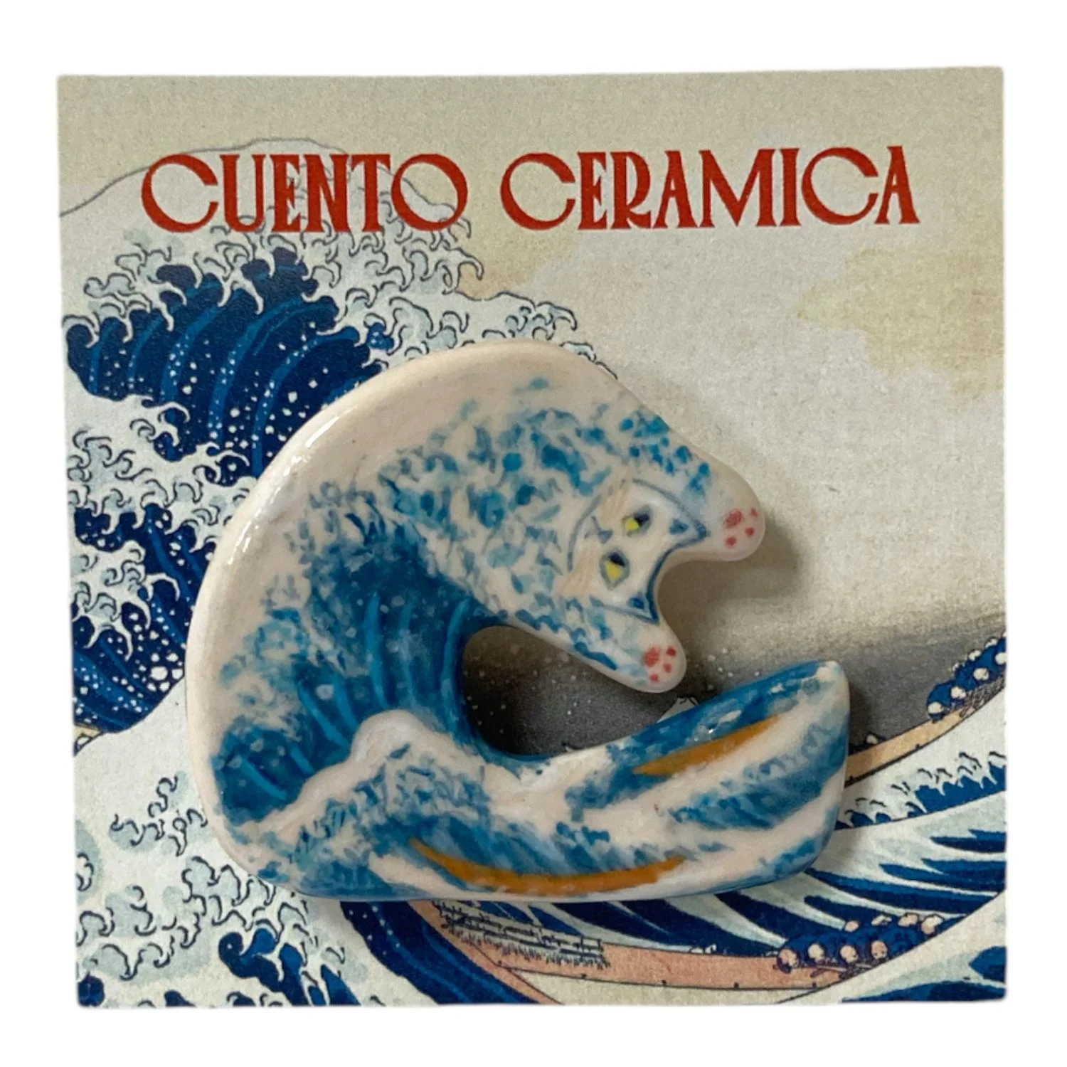 Брошь с аллюзией на картину Кацусики Хокусая "Большая волна в Канагаве" бренда Cuento ceramica выполнена из керамики и покрыта глянцевой глазурью и станет прекрасным подарком любителю искусства и котиков.