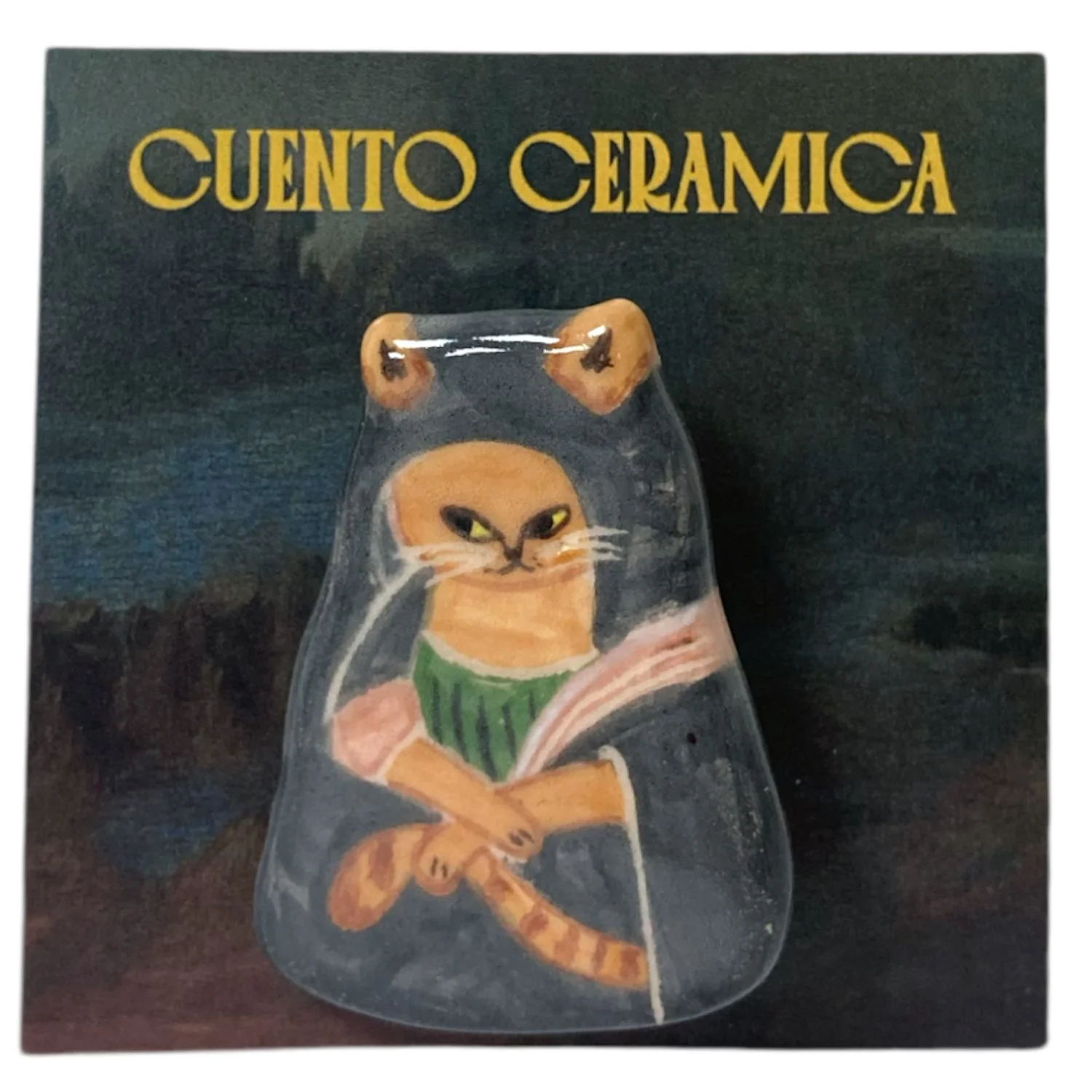 Брошь с аллюзией на картину Леонардо да Винчи "Мадонна Литта" бренда Cuento ceramica выполнена из керамики и покрыта глянцевой глазурью и станет прекрасным подарком любителю искусства и котиков.