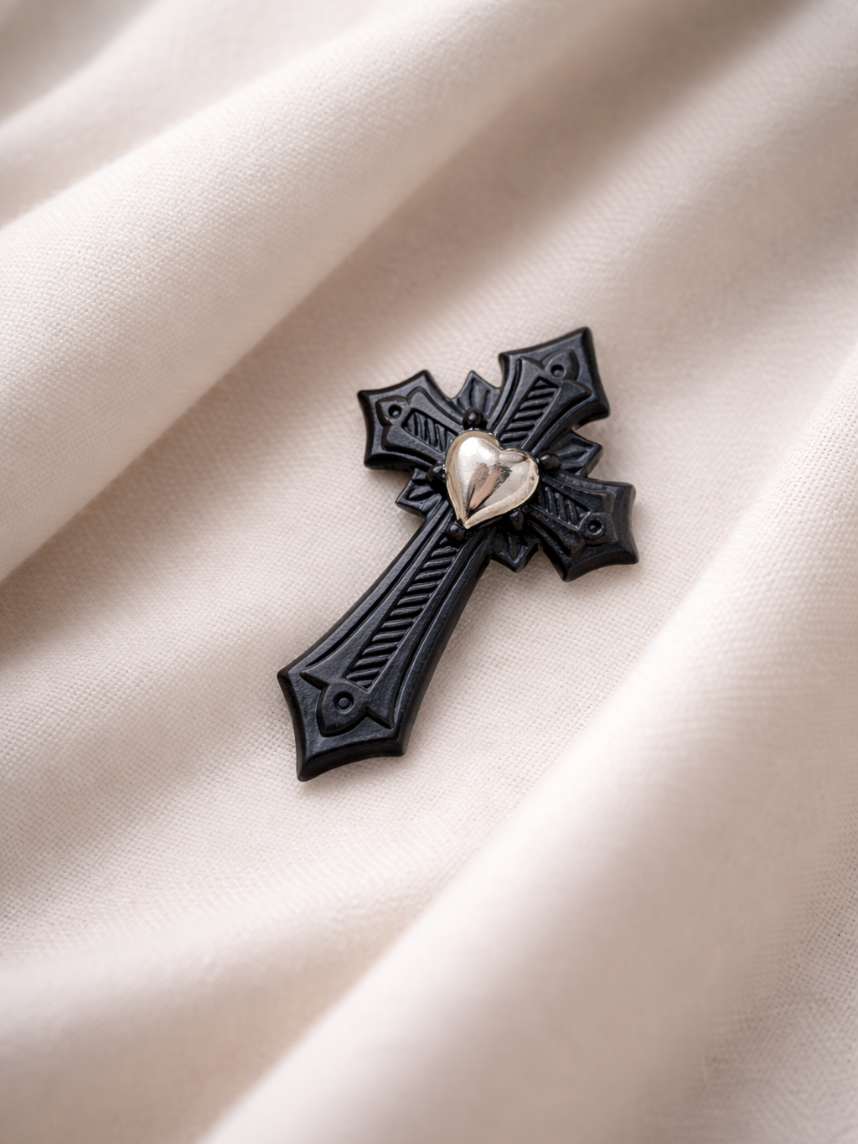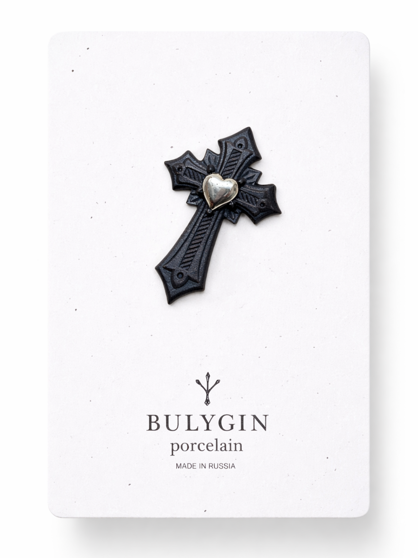 Фарфоровая брошь «Крест» в чёрно-серебряном цвете от бренда BULYGIN porcelain.