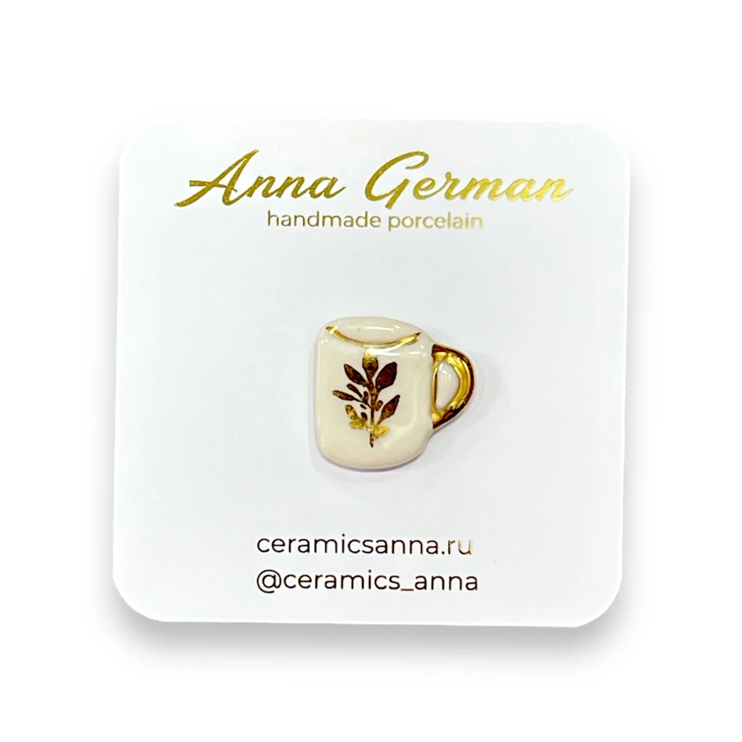 Элегантная фарфоровая брошь в форме кружки с листиком расписанной золотом.  Ручная работа от петербургской керамистки Анны Герман.