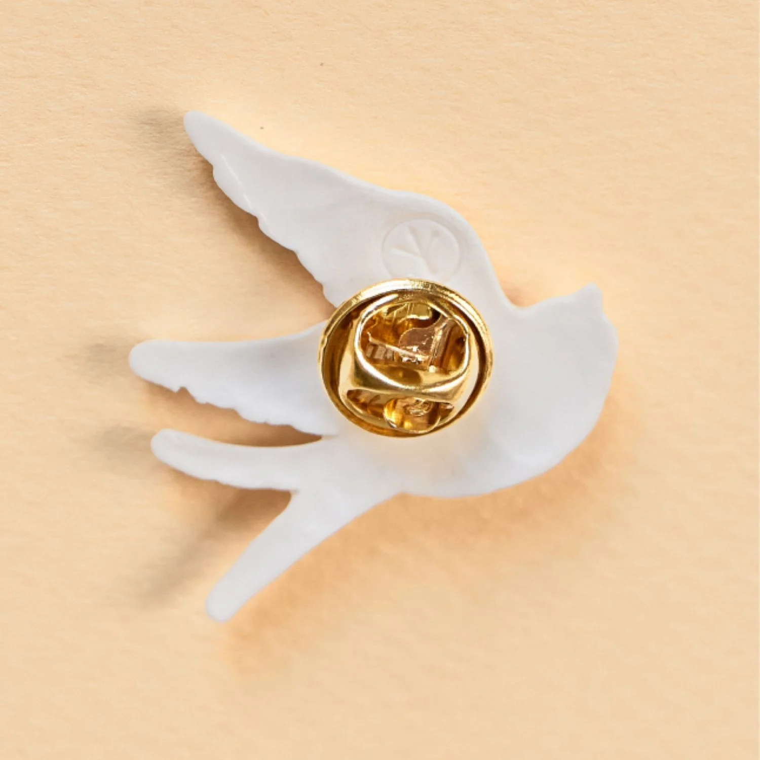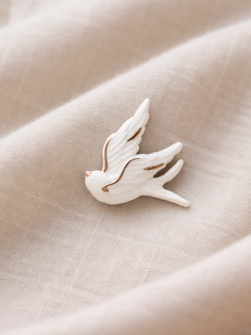 Фарфоровая брошь «Ласточка» бело-серебристого цвета.