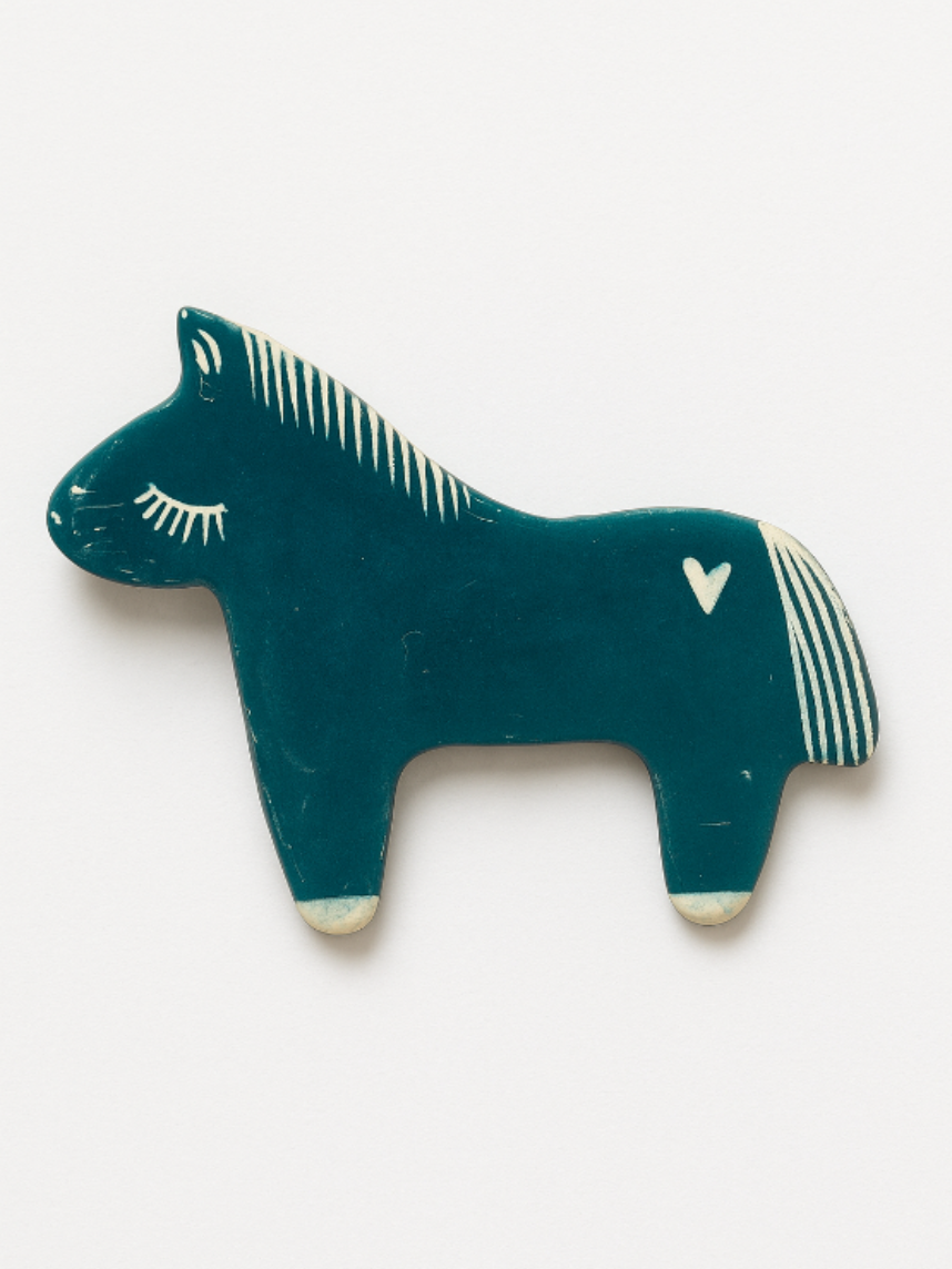 Брошь ручной работы Лошадка с сердечком, тёмно-зелёная, керамика