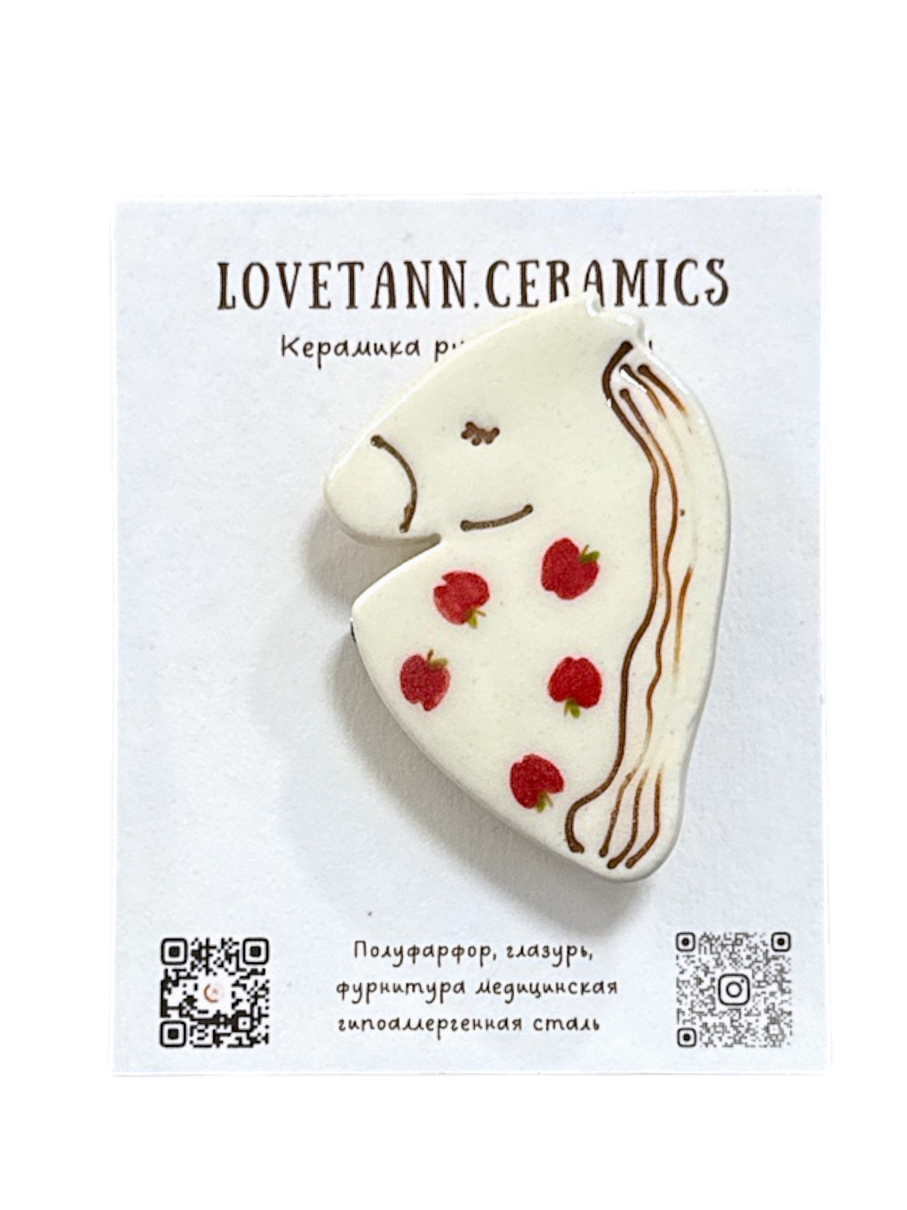 Брошь ручной работы «Лошадка» с яблоками, полуфарфор
