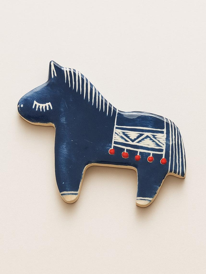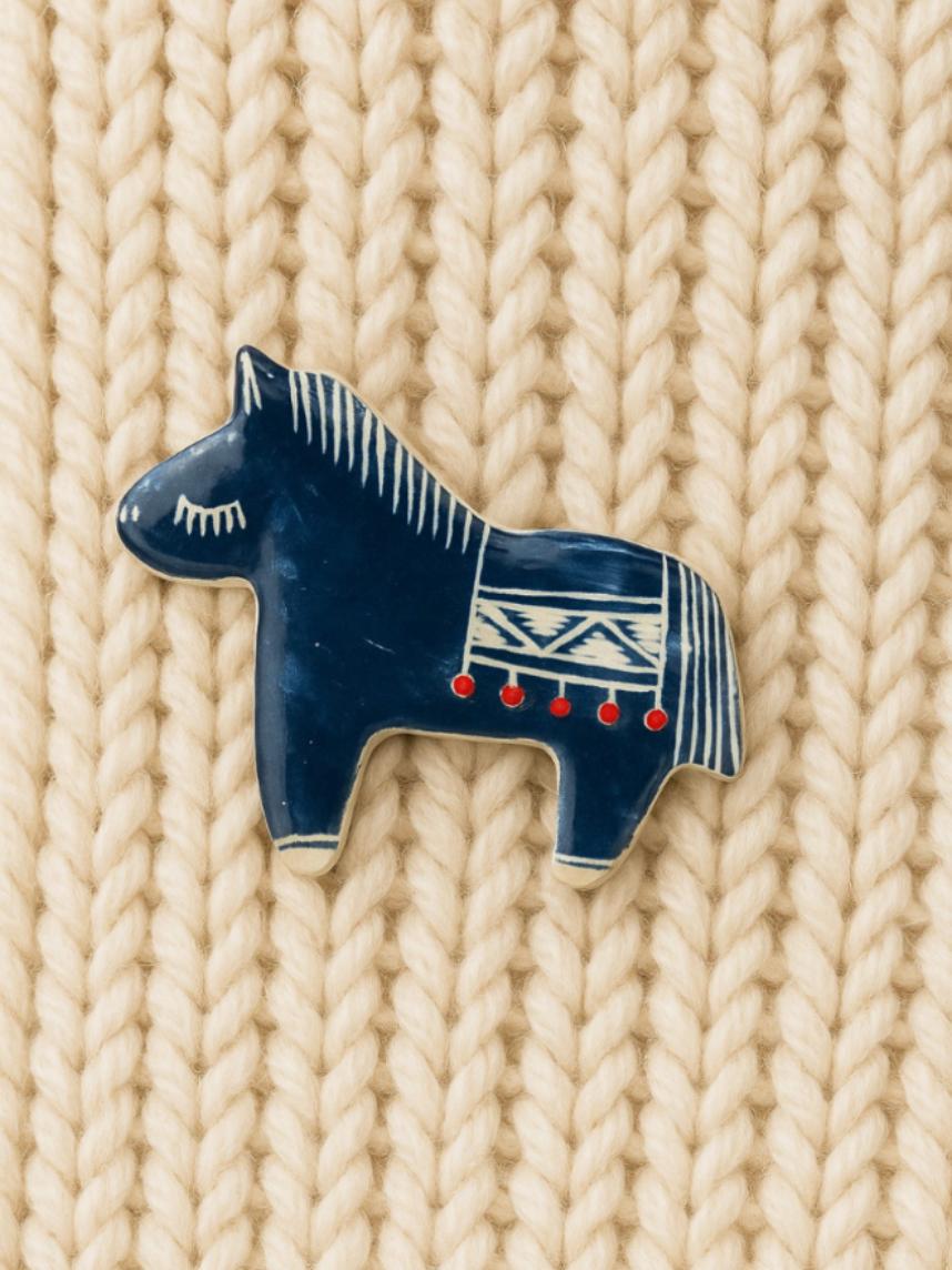 Брошь ручной работы Лошадка в пончо, синяя, керамика
